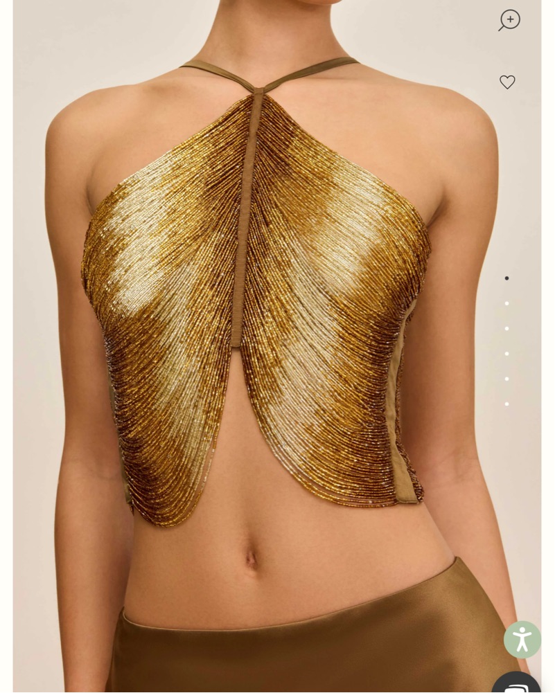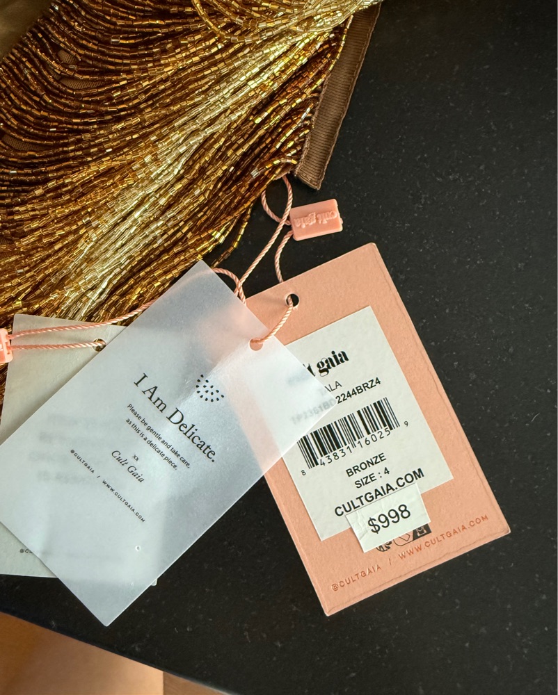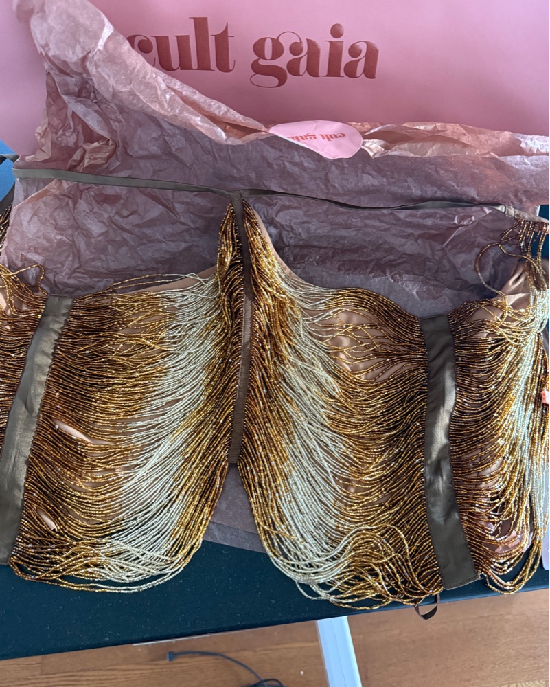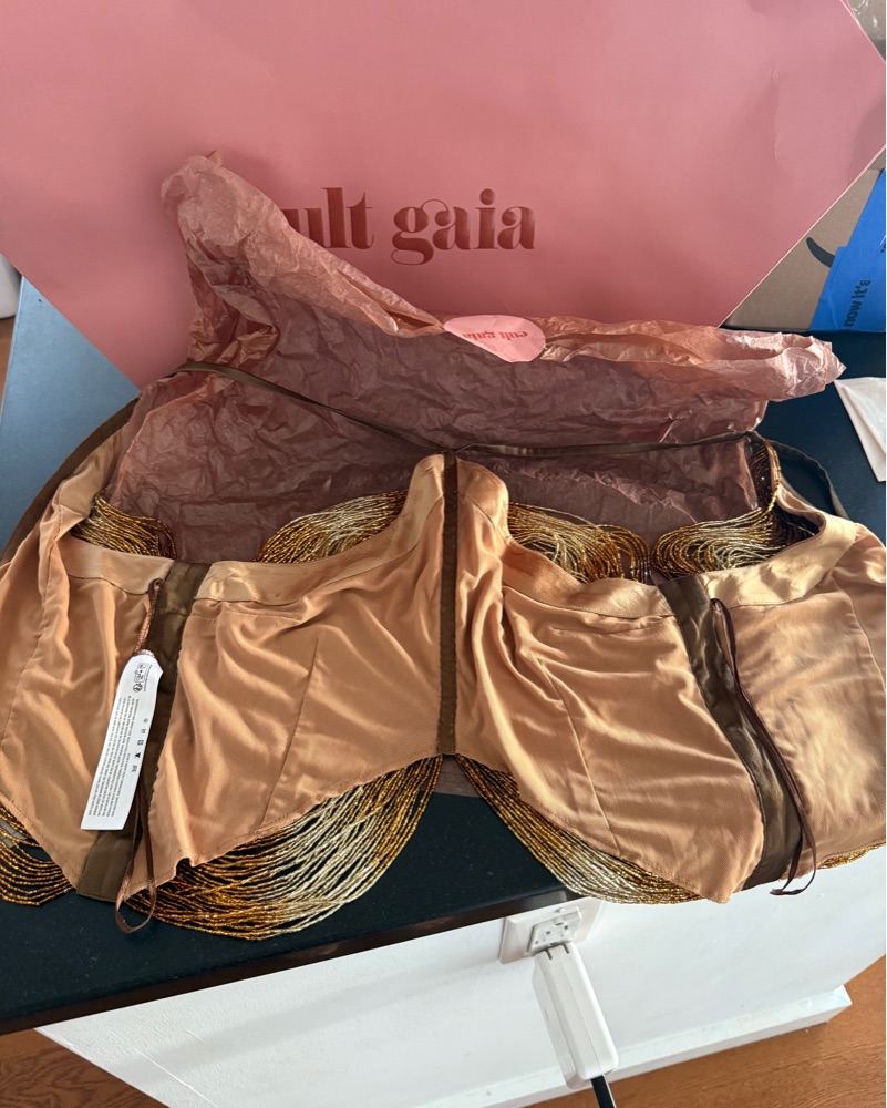 NWT bronze beaded top by Cult Gaia, tried on for photos, retails $998, fits a true size 4, very delicate, handle with care! fabric is easily tearable (mesh, silk, and beads)