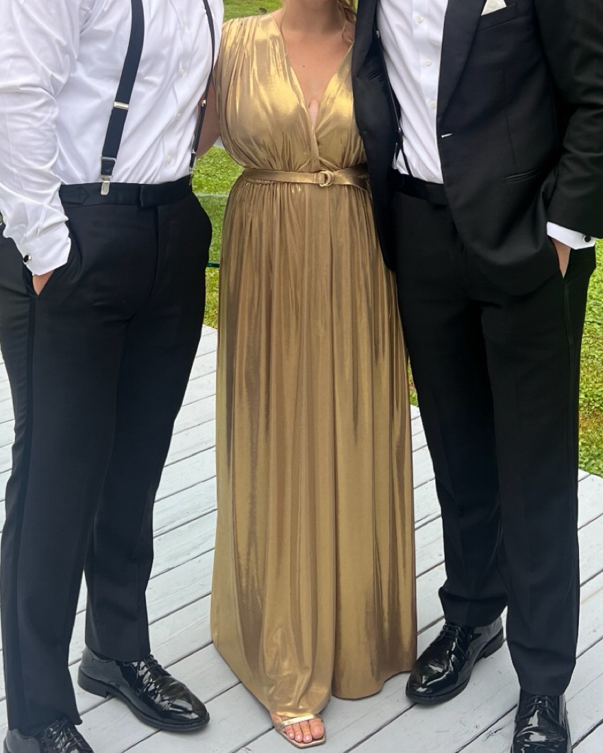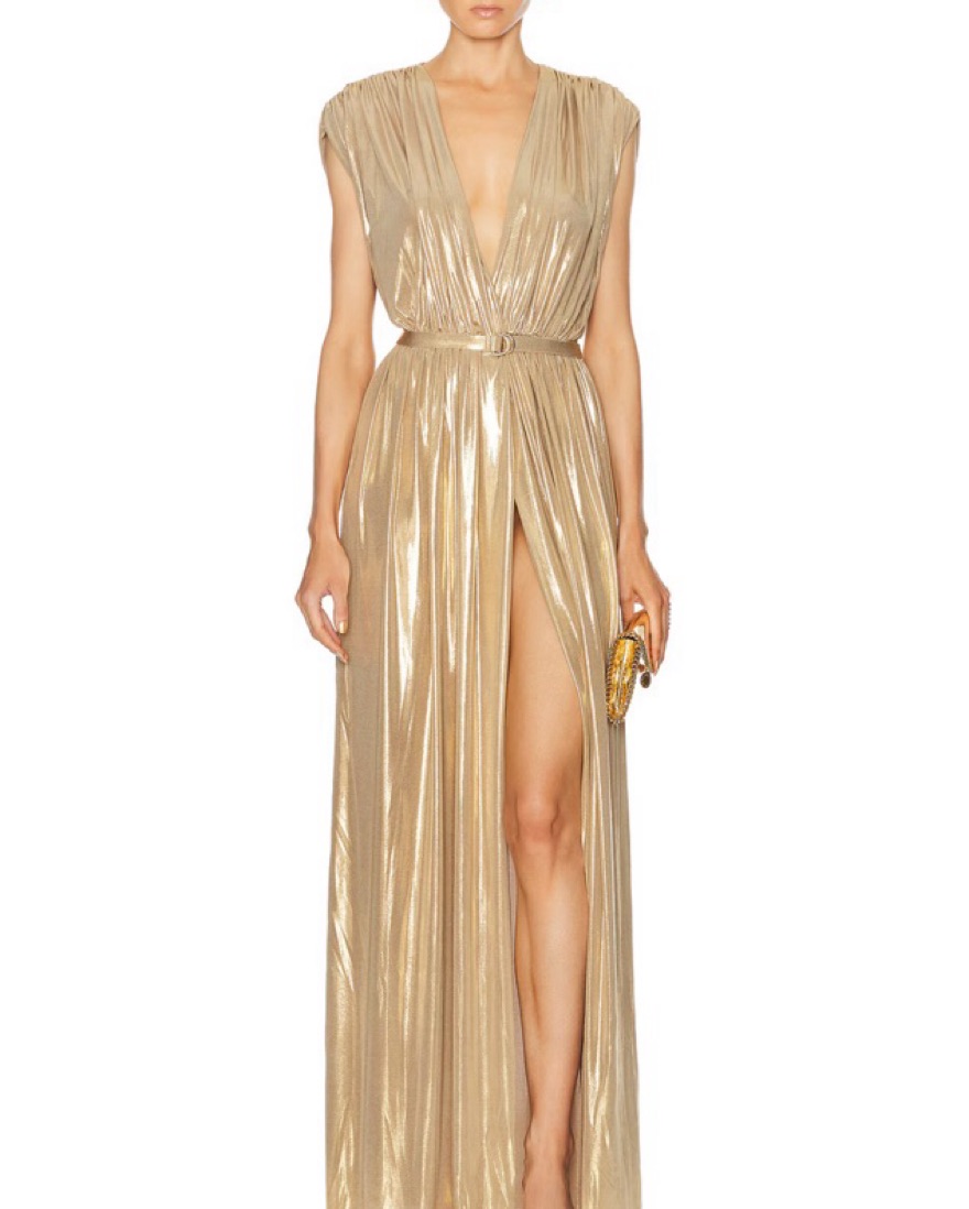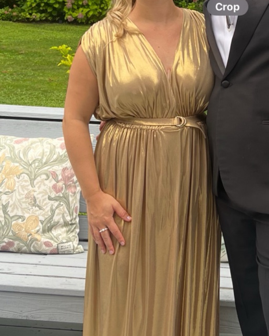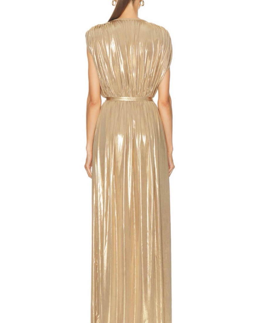 Norma kamali athena gown in gold. Size XS hemmed to fit someone 5ft with 3-4 inch heels, or can be worn as a midi on someone taller. Worn once. Comes with belt