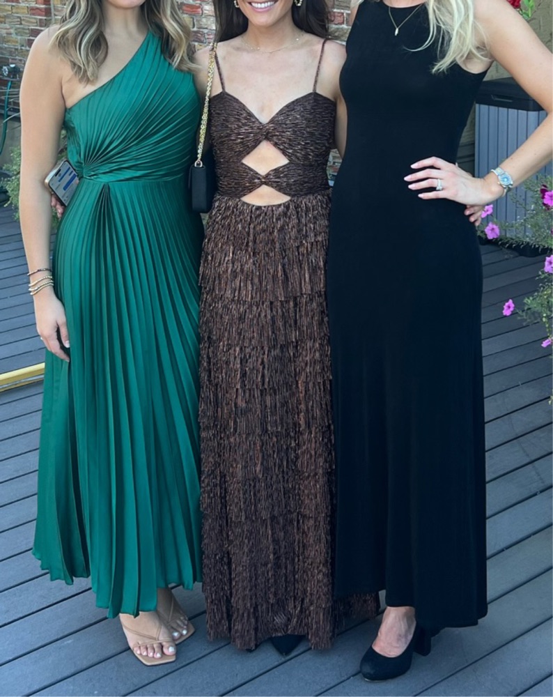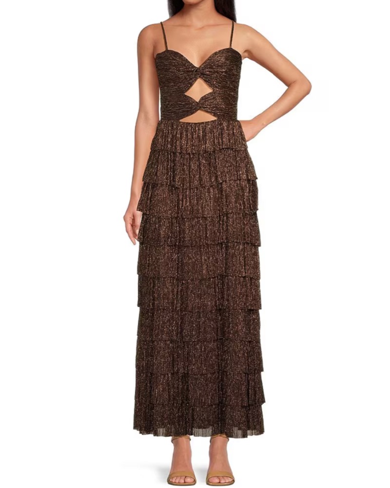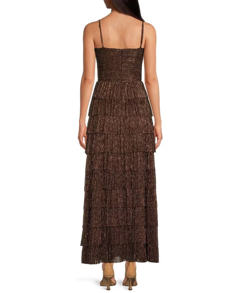 Grace Metallic Plisse Sweetheart Neck Cut-Out Tiered Dress in "Copper" - super pretty metallic brown. Stretchy, comfortable, flattering.