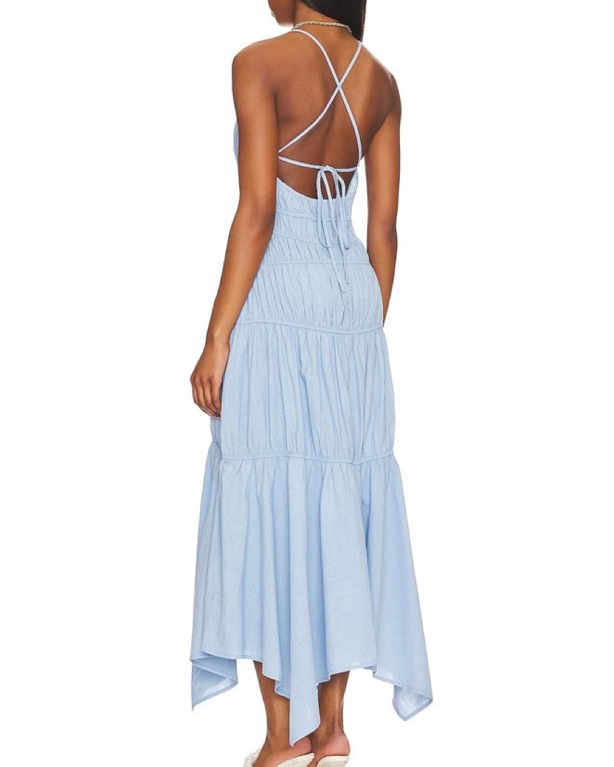 From revolve. Made with 100% cotton, this blue dress showcases a sweetheart neckline, thin shoulder straps, front cut-out detailing, a tiered design and back self-tie fastening for closure.