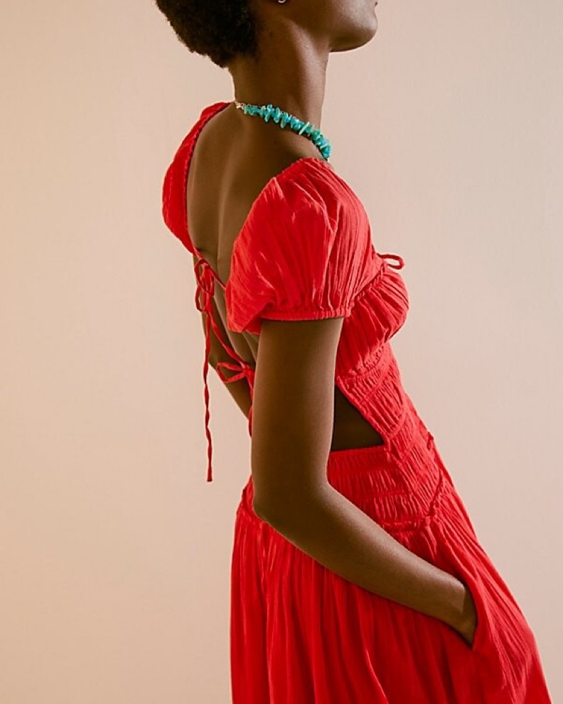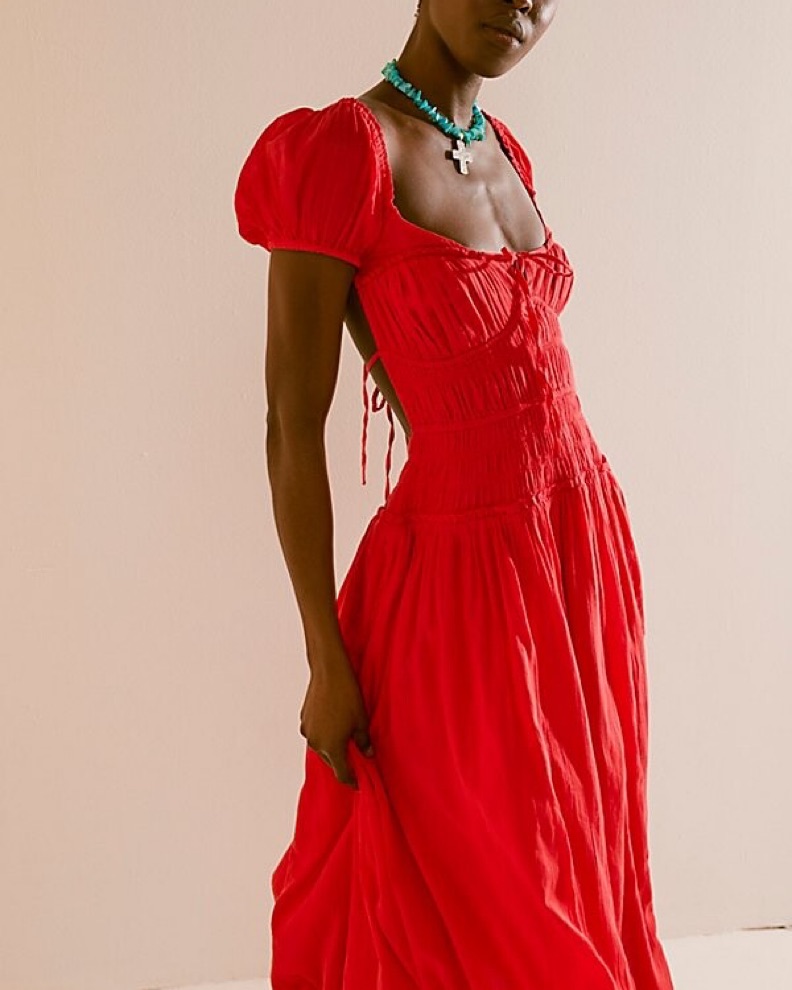 This stunning maxi dress is perfect for a glamorous event or night out. The vibrant red hue and dramatic puff sleeves create a bold, eye-catching look.