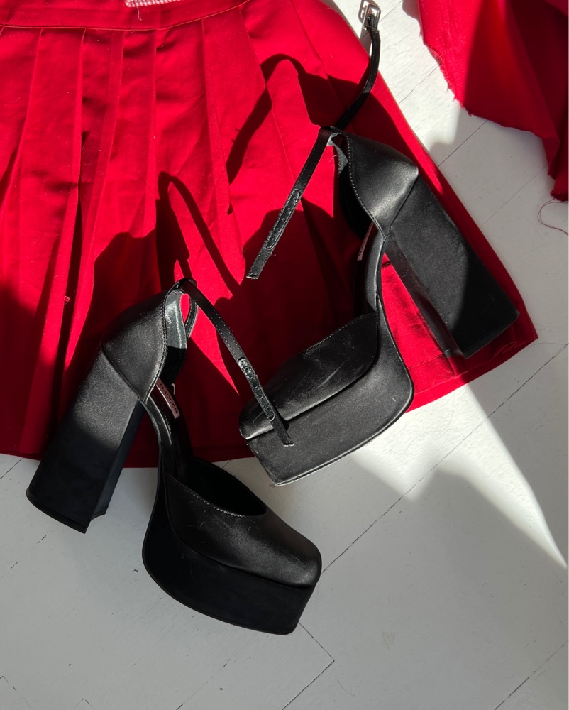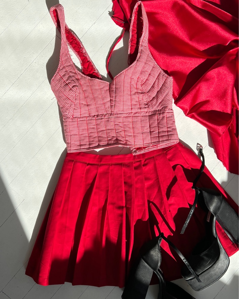 Handmade Halloween costume! Rental includes xs red pleated skirt, corset top, size 7 Steve Madden heels, red cape, hair bow accessories, and for the wolf costume includes wolf hat, and vest