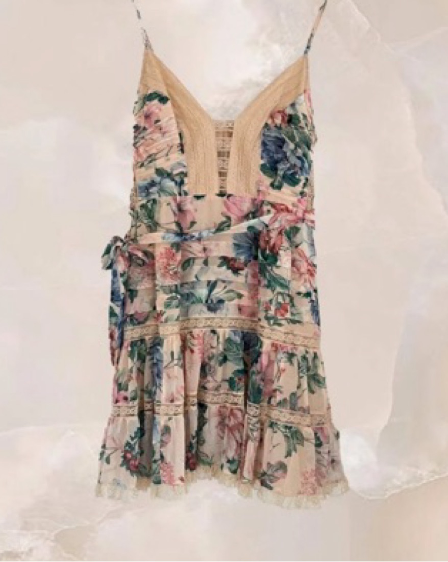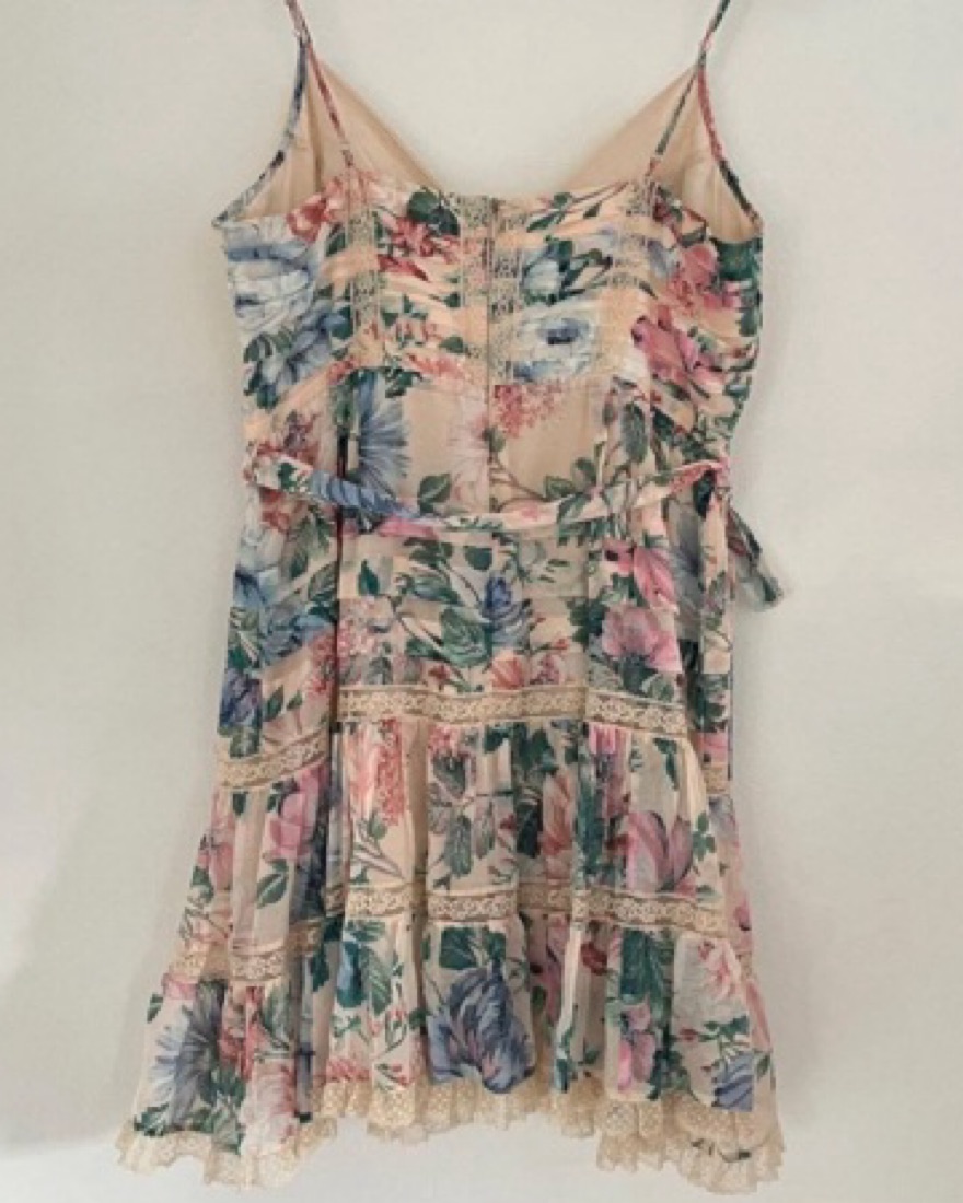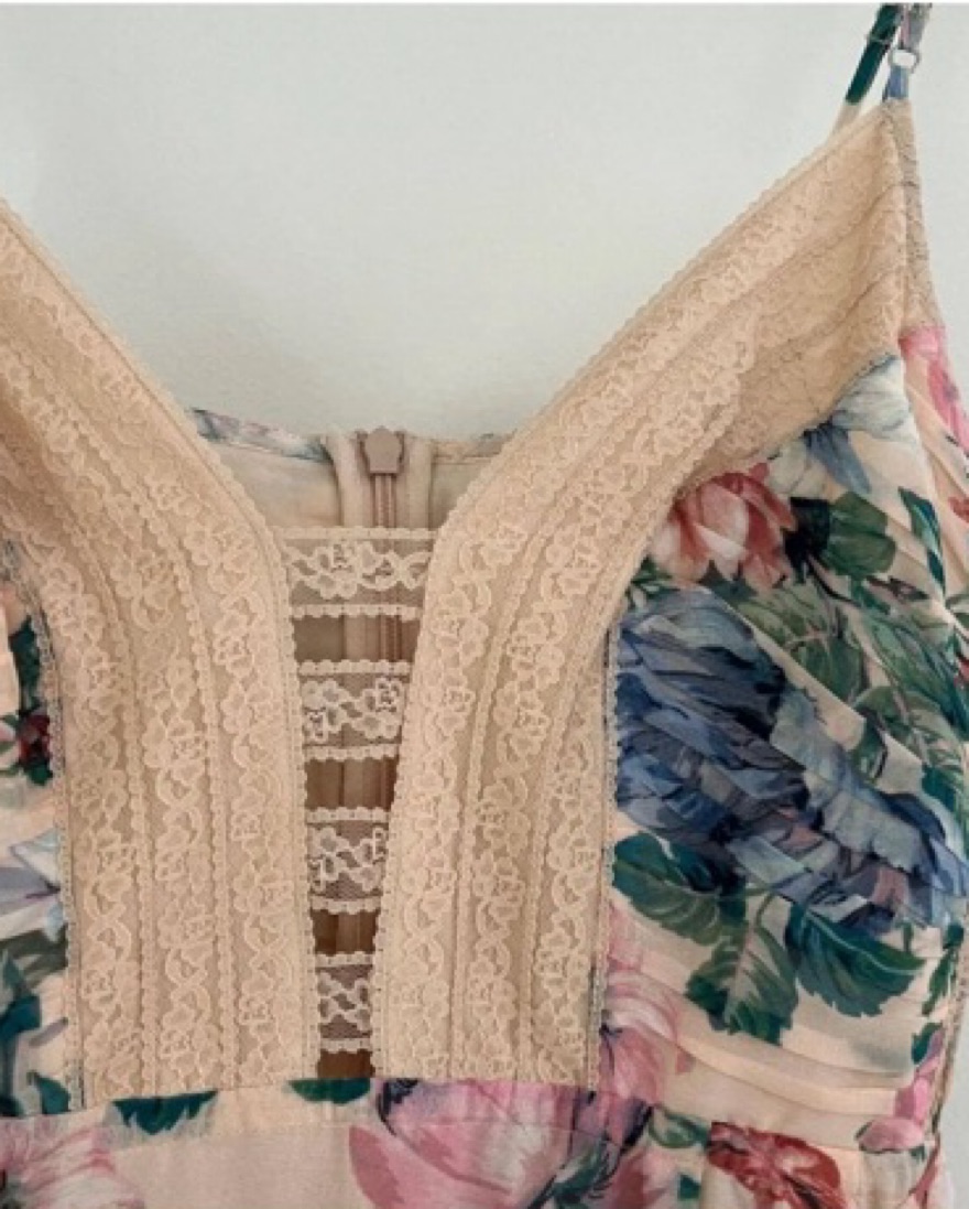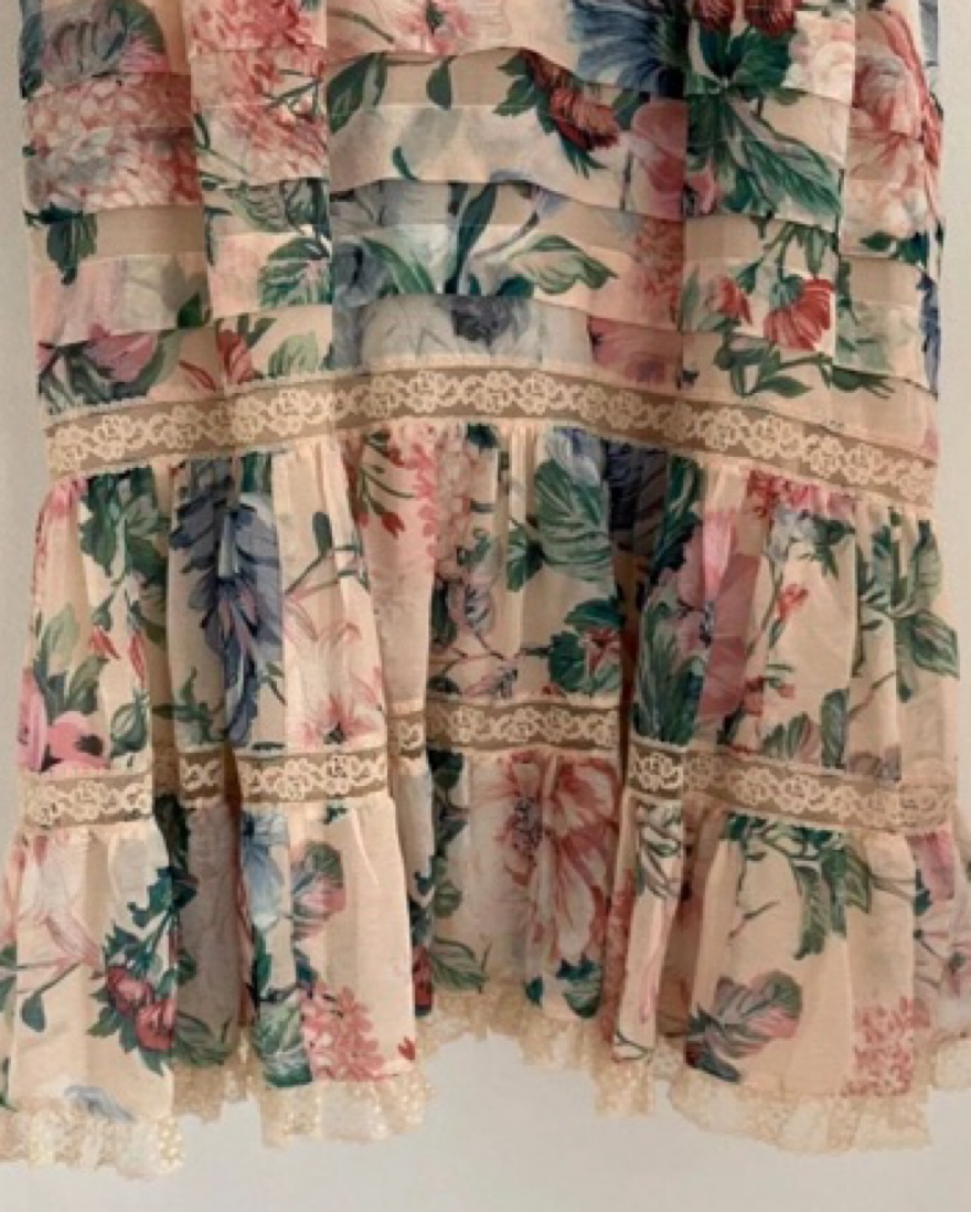 In amazing condition - lightweight woven dress, gorgeous floral pattern with lace trim detail, insert panels throughout, pleating at bodice, A-line skirt for soft movement, ruffle detail. Size 0 but fits XS / S