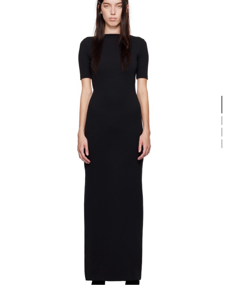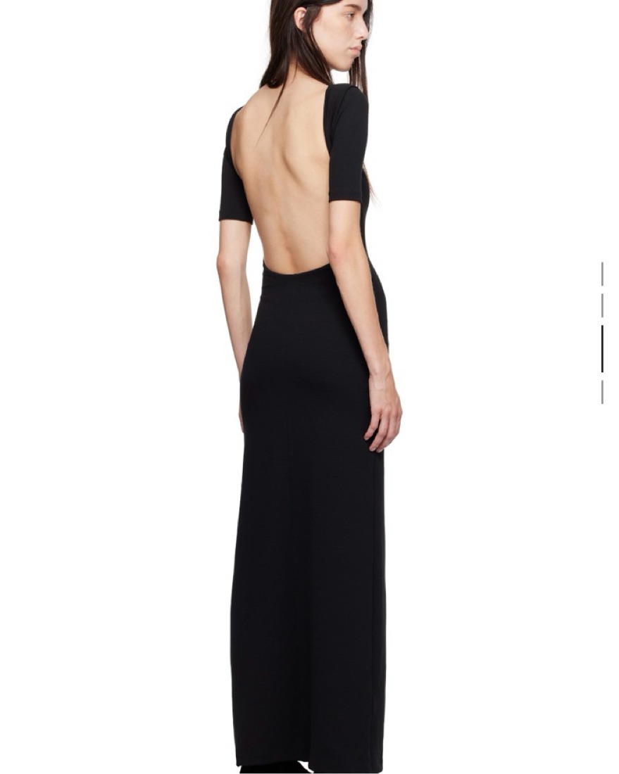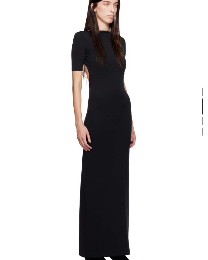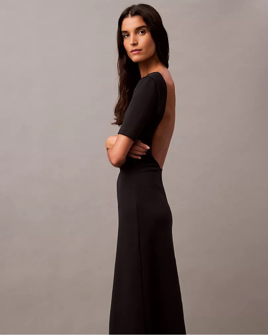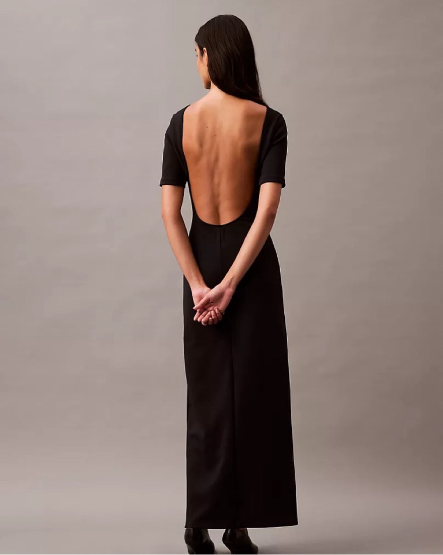 This stunning black maxi dress is perfect for any formal occasion. The sleek, minimalist design and open back create a sophisticated and alluring look. Calvin Klein 🤍 90s minimalism