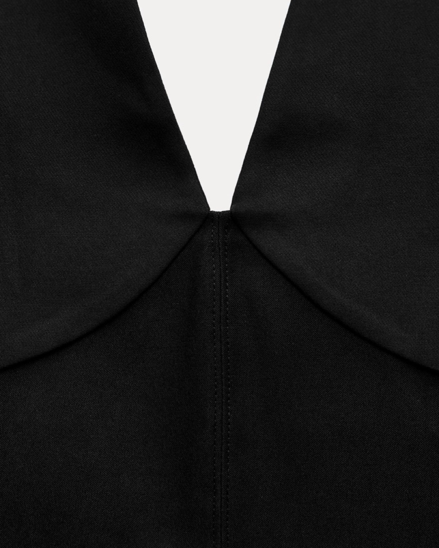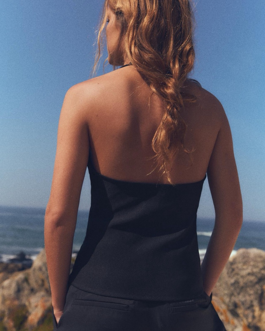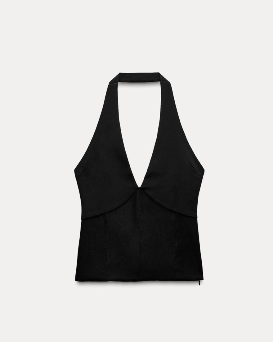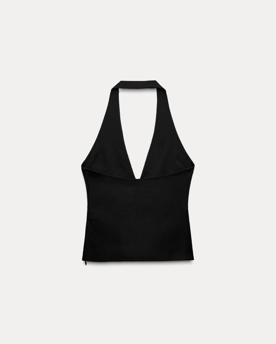 Top made of stretch fabric with halter V-neckline. Open back. Hidden zip closure at side. M. Never worn