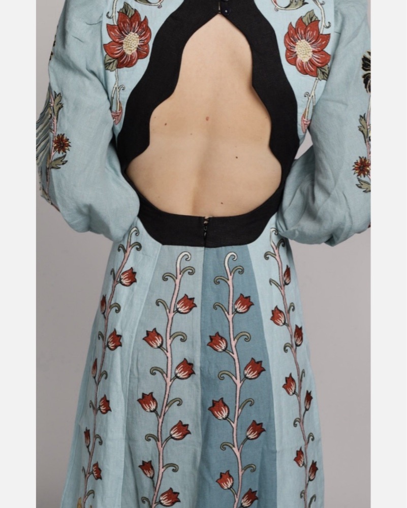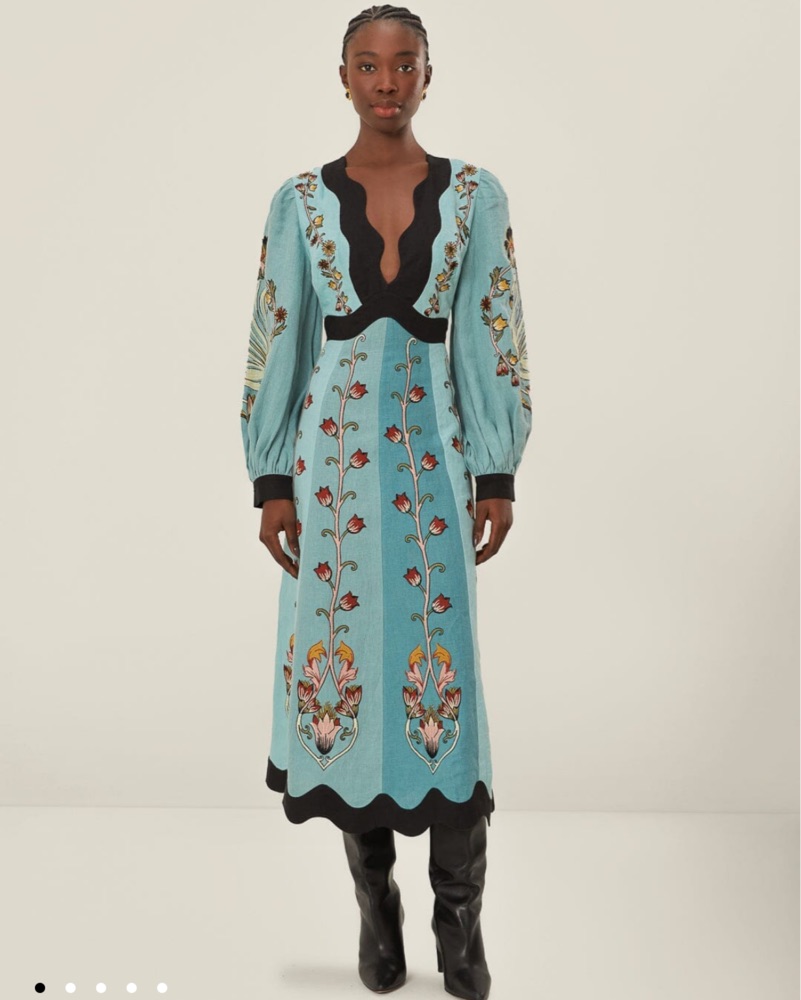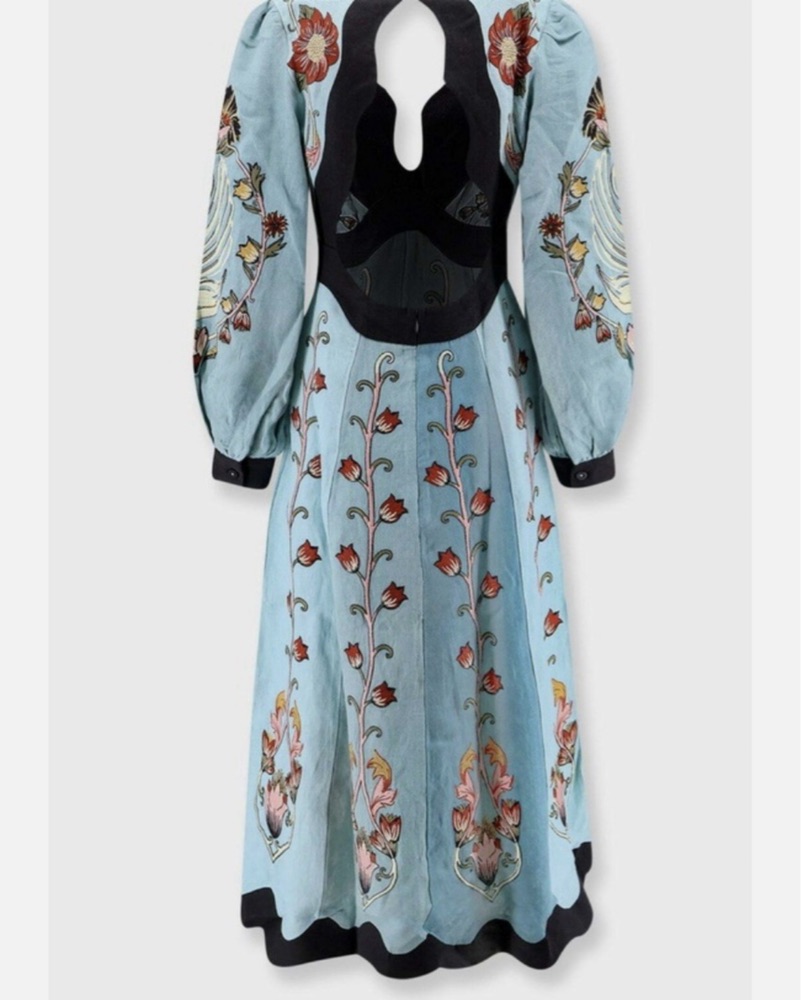 Embrace the enchanting elegance of the Blue Flowing Beauty Embroidered Long Sleeve Midi Dress, with its captivating V neckline and intricate embroidery. This serene sky-blue dress is adorned with whimsical floral and swan motifs, framed by distinctive black trim