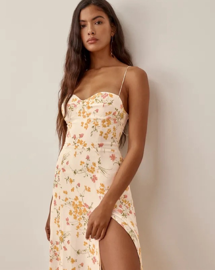 Reformation juliette midi dress with sweatheart neckline, tie straps, and a side slit, in color aries (white with floral print).