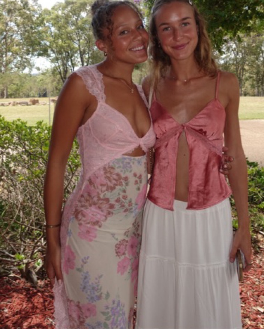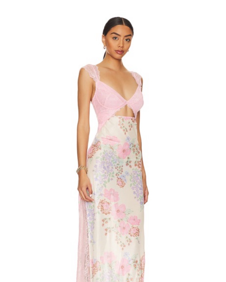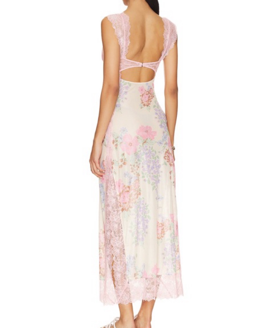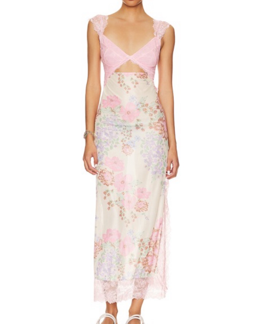 This gorgeous floral maxi dress exudes a romantic, feminine aesthetic. The delicate lace trim and adjustable straps create a flattering silhouette, perfect for a summer garden party or breezy beach wedding.