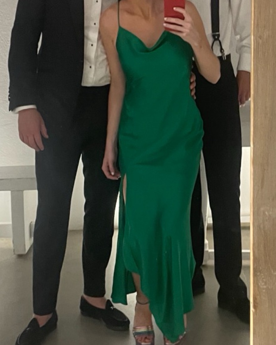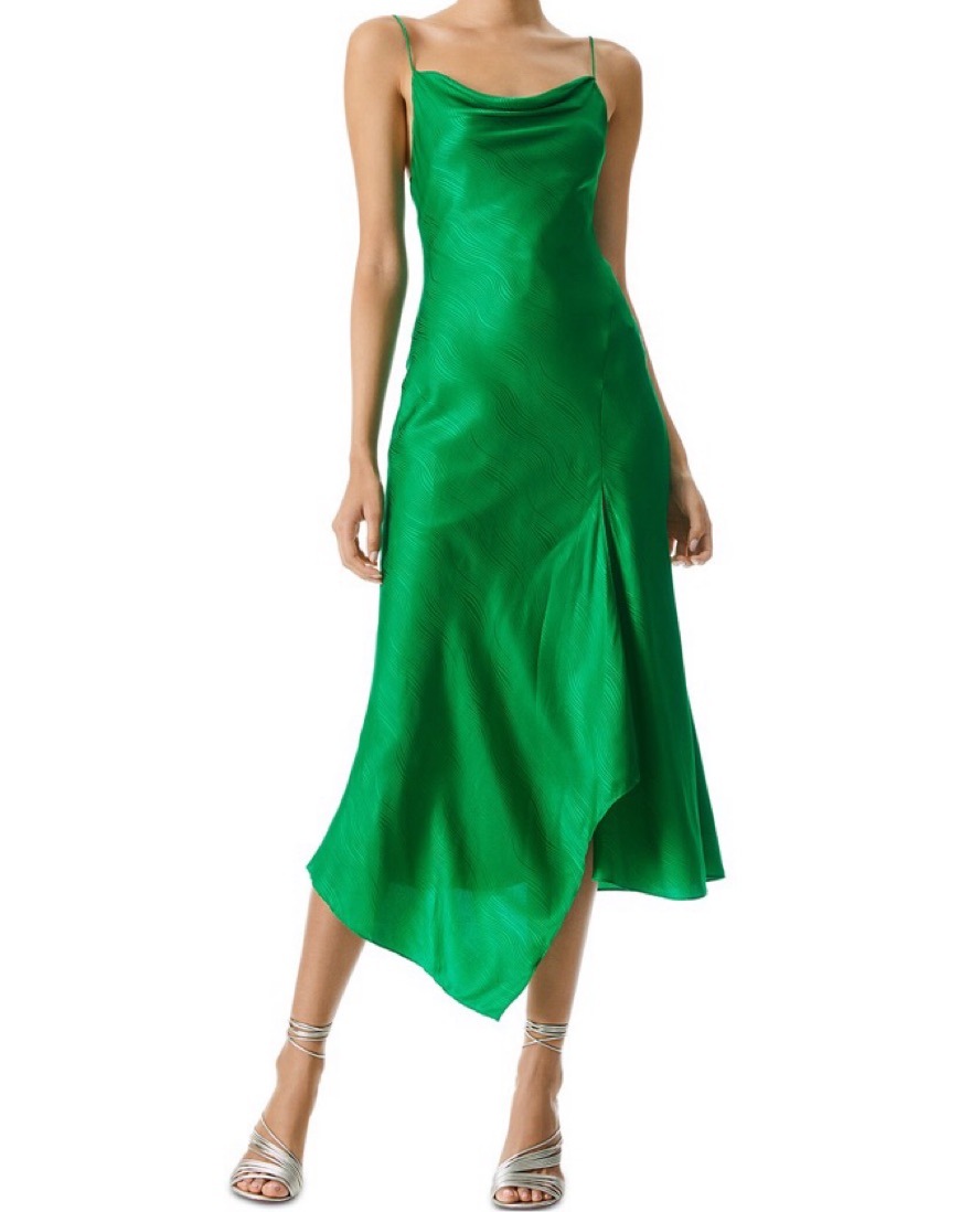 • Cowl neck • Sleeveless • Back zipper closure • Slip silhouette • Asymmetric hem • Allover pattern • Lined