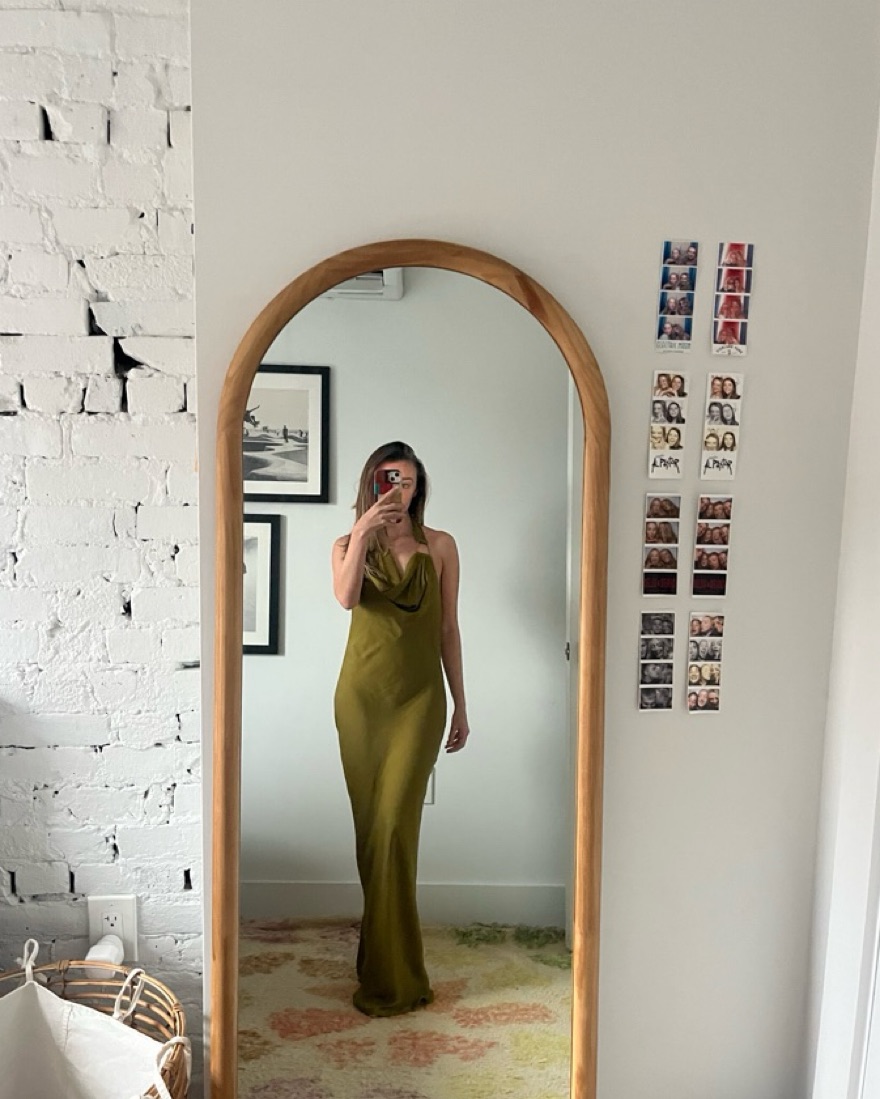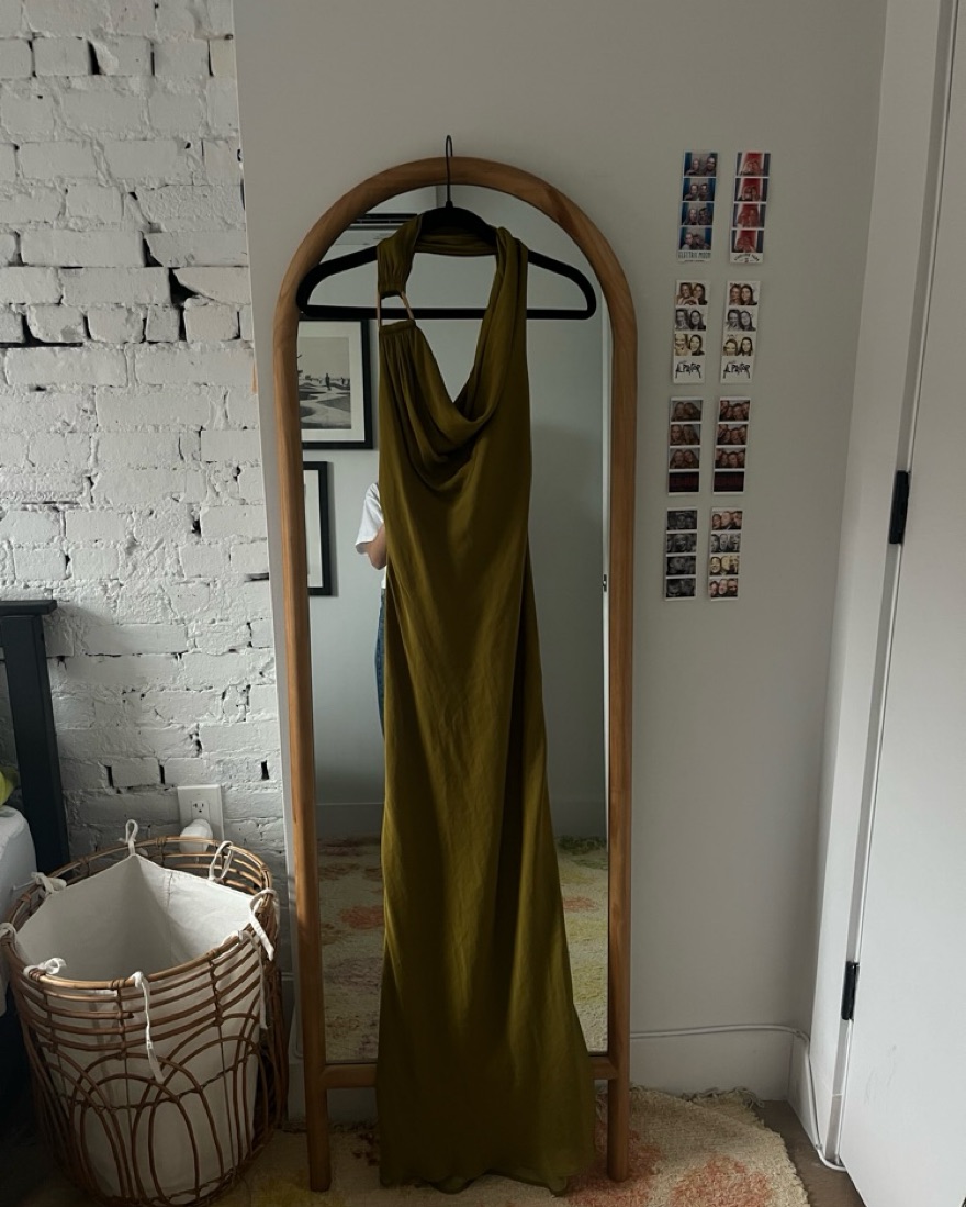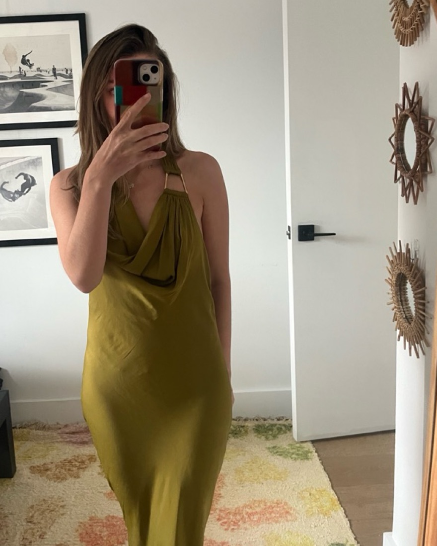 This stunning olive green satin maxi dress exudes sophistication and elegance. Backless on the back.It would be perfect for a formal event or special occasion.