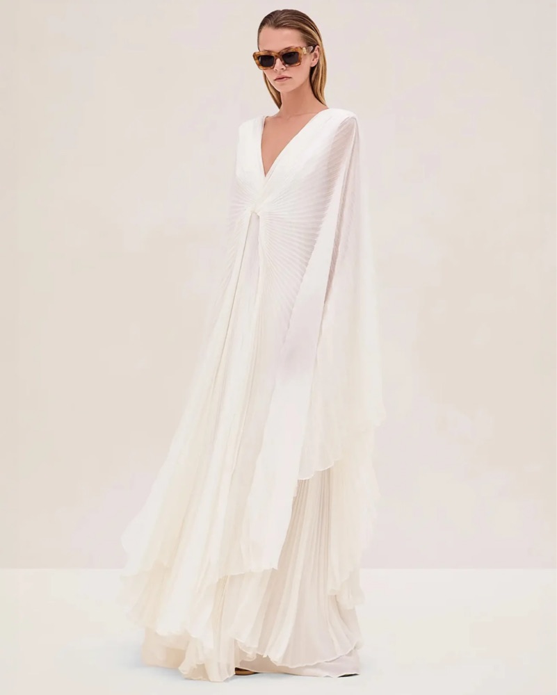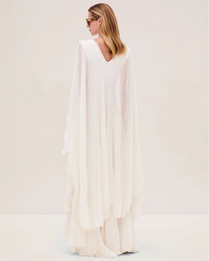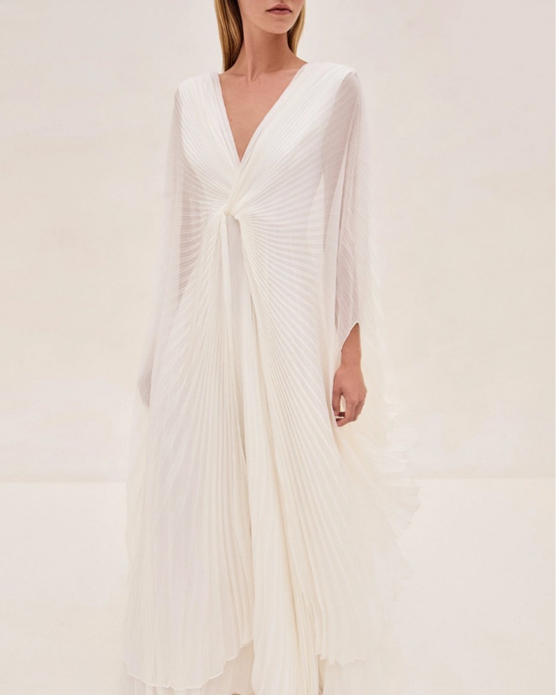 New with tags, never worn. This stunning pleated maxi dress is perfect for formal events or glamorous occasions. The flowing silhouette and dramatic cape sleeves create an effortlessly chic look.