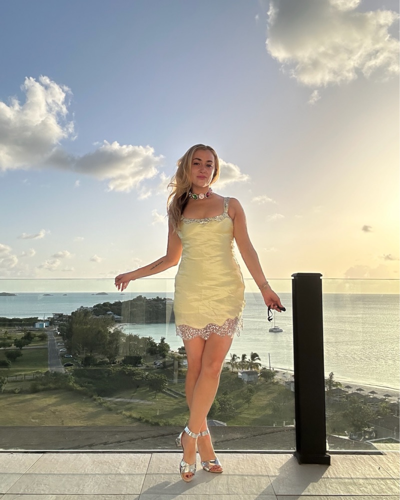 Crafted from soft silk linen, the dress features sequin-embellished straps and a scalloped hemline that catches the light with every movement. A simple yet enduring silhouette, balanced by intricate detailing.