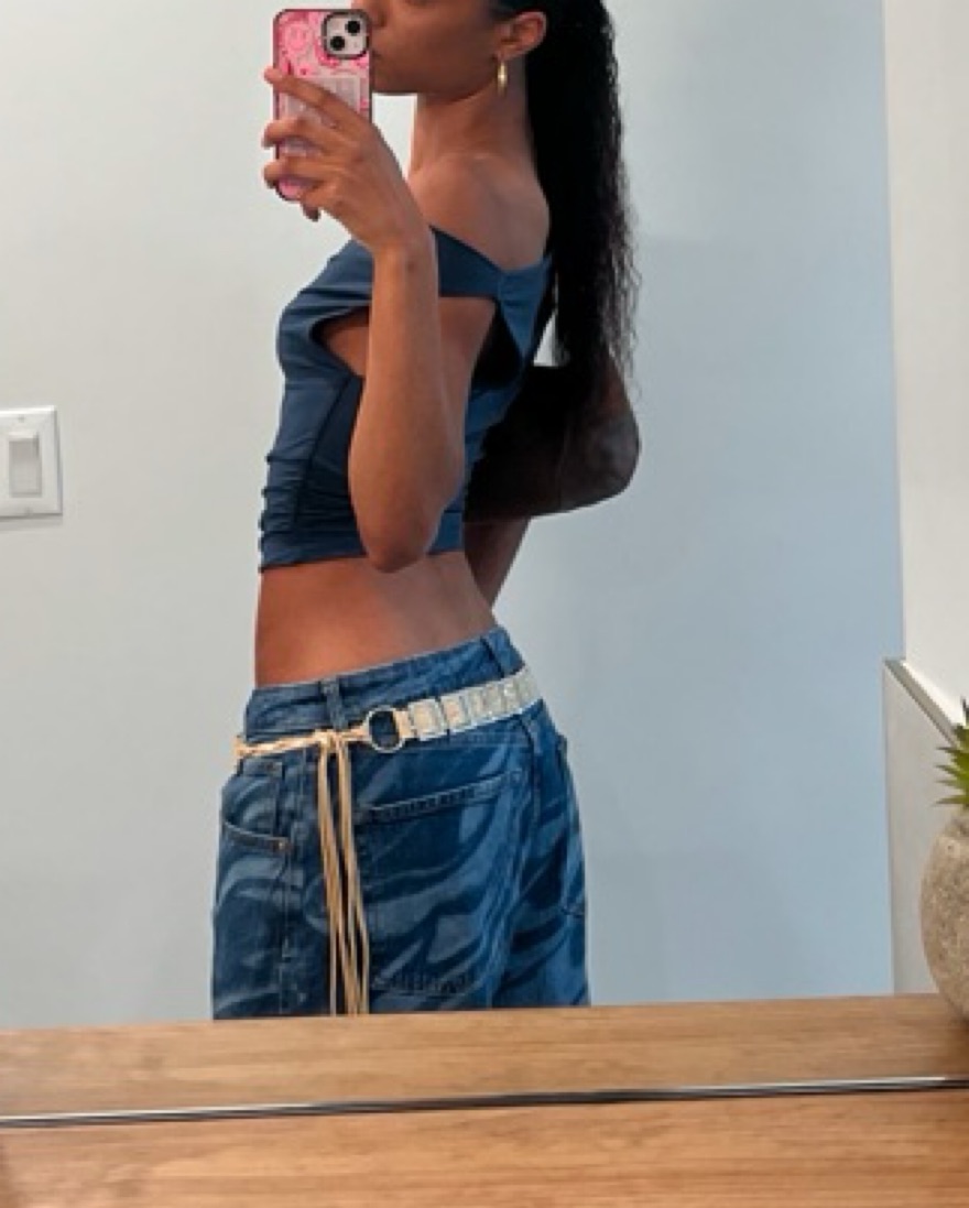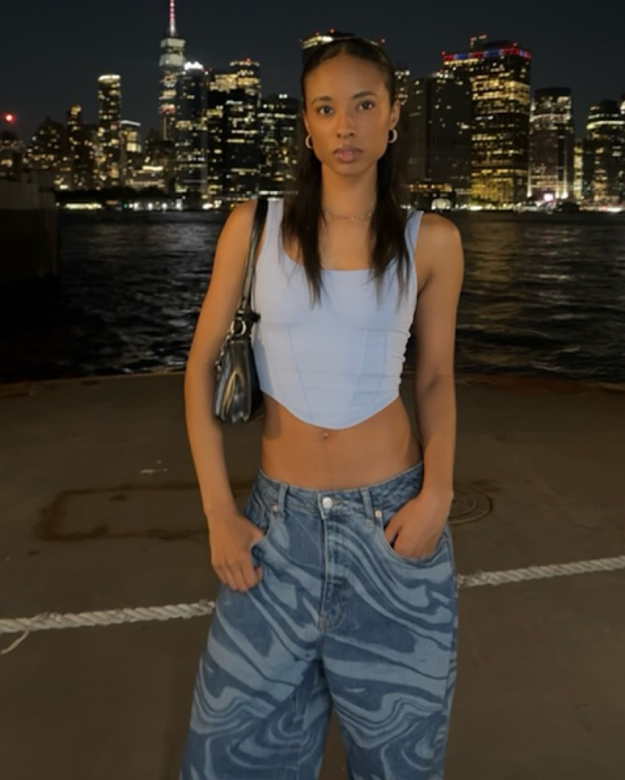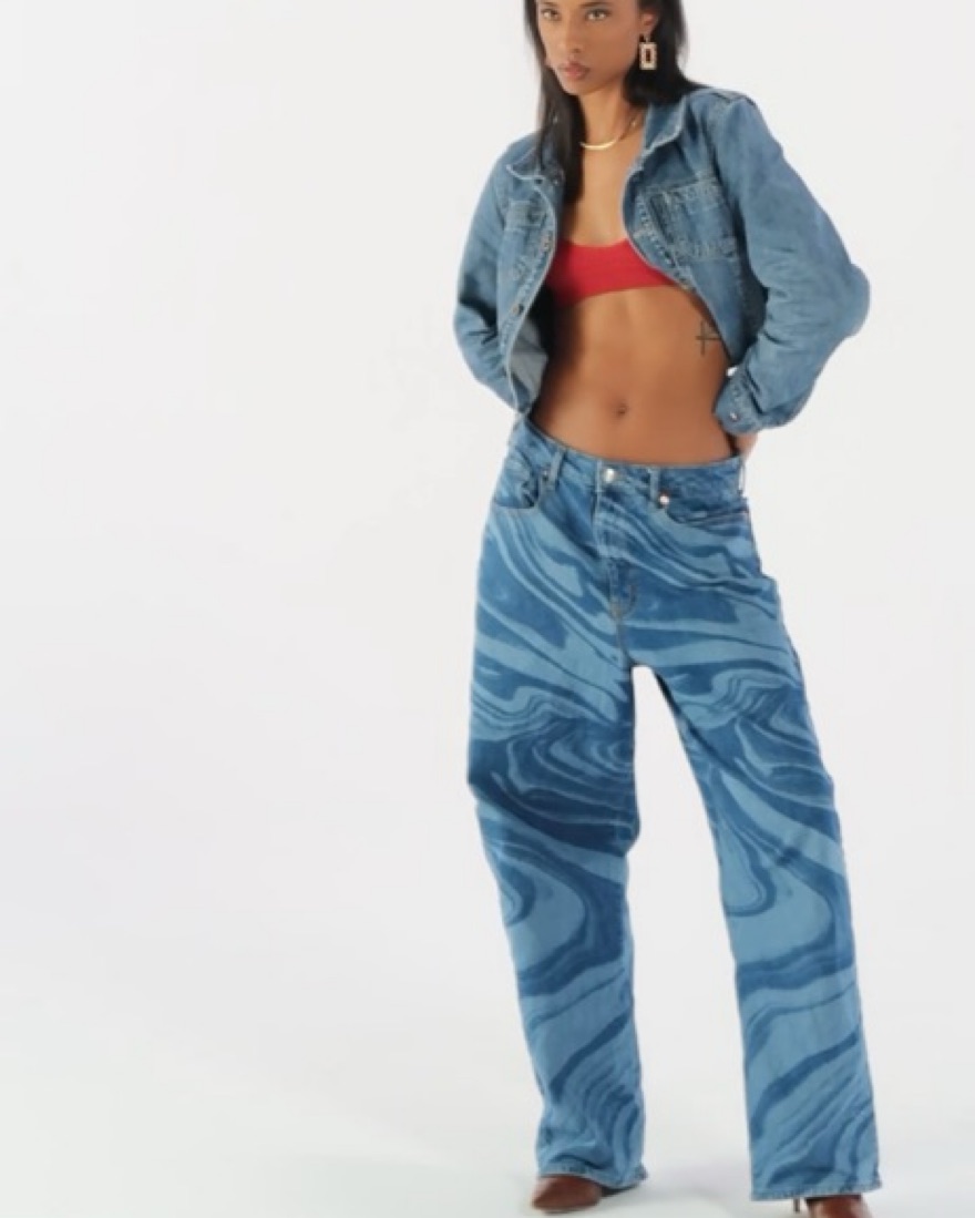 eye-catching baggy jeans that feature a bold, swirling print! it’s a size 10 but I wear it low waisted for a super baggy look (i’m a 2-4 in bottoms and i LOVE the fit of these)
