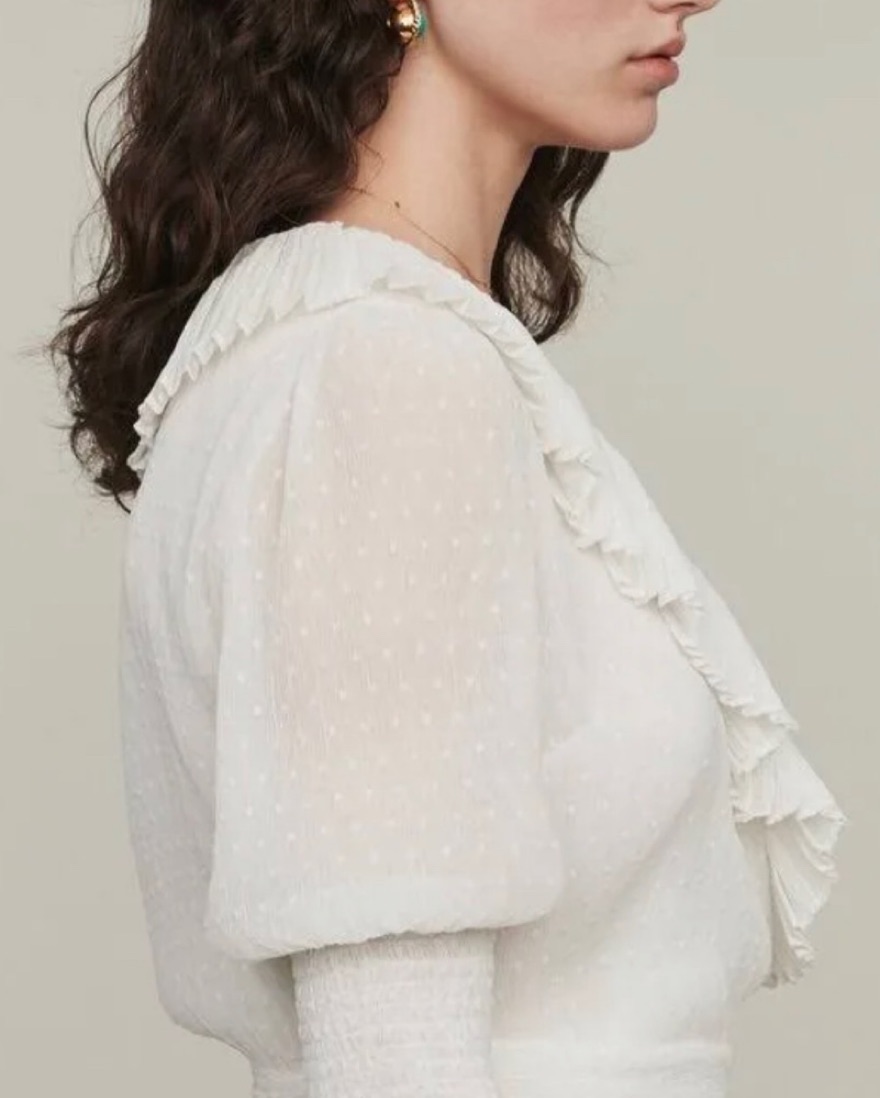 Maje top with wrap style. V-neck. Beautiful polka dot detail. Made in France. Dry cleaned. Smoke and pet free home.