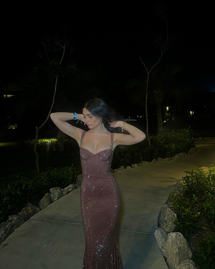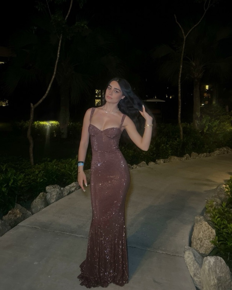 beautifully beaded brown gown. body tight and very flattering! has a gorgeous train. sold out everywhere!!