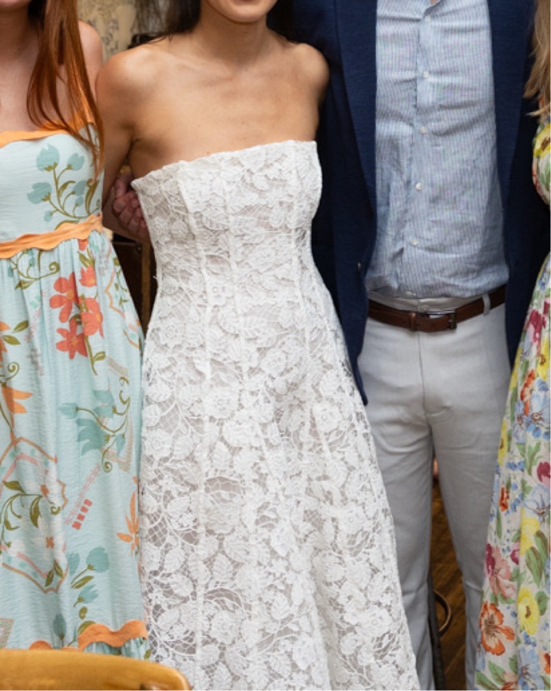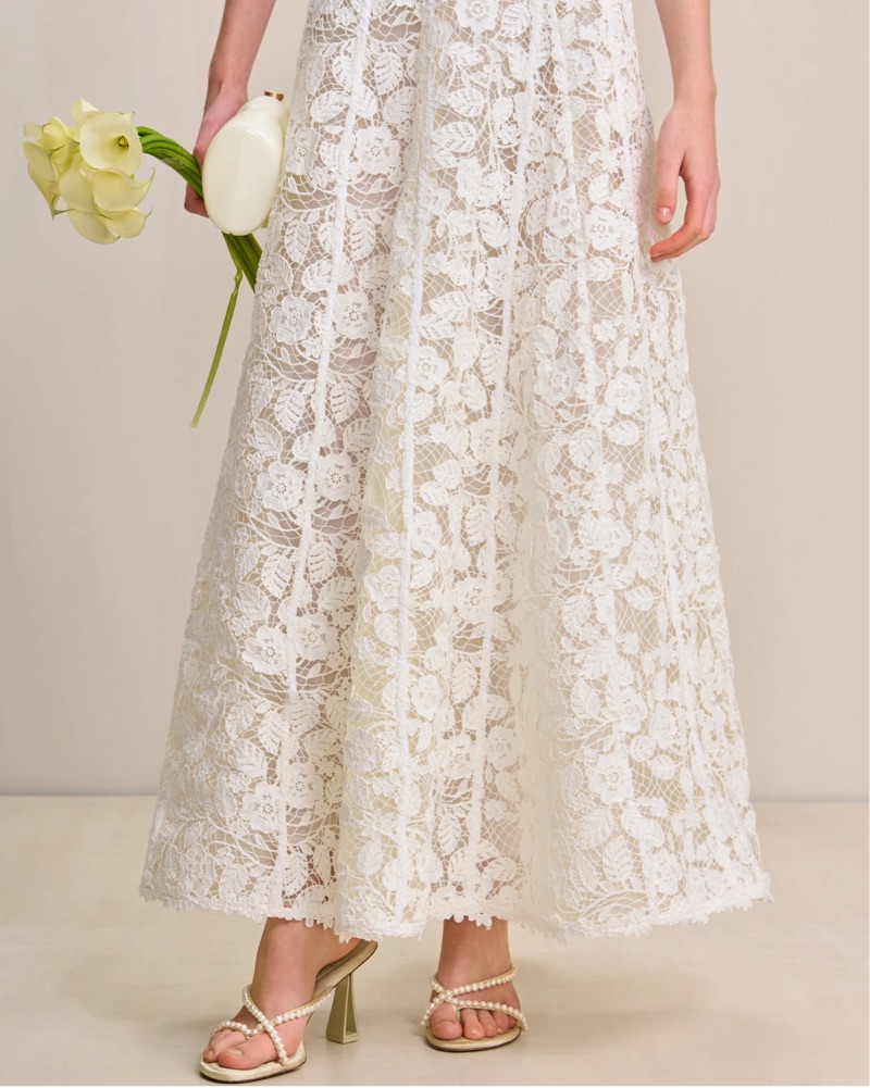 A-line sleeveless maxi-length dress with intricate floral lace. Only worn once for a bridal shower.