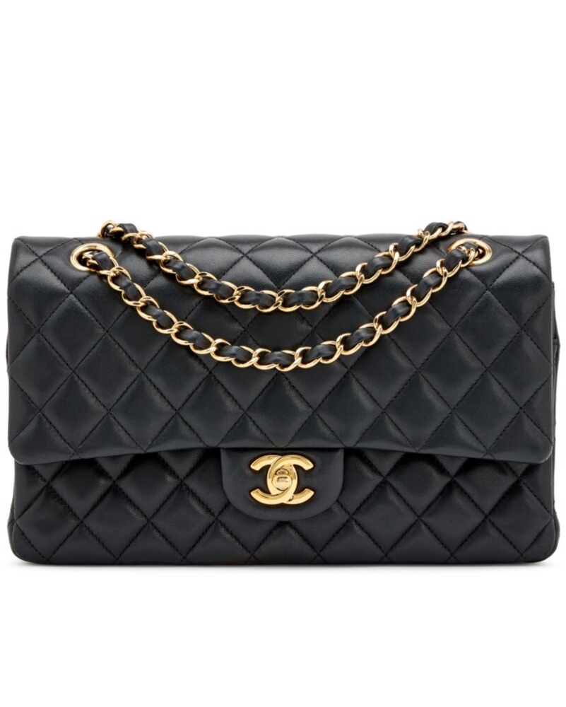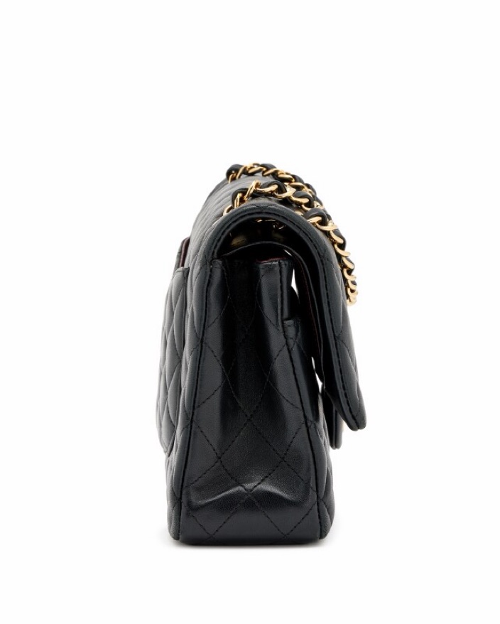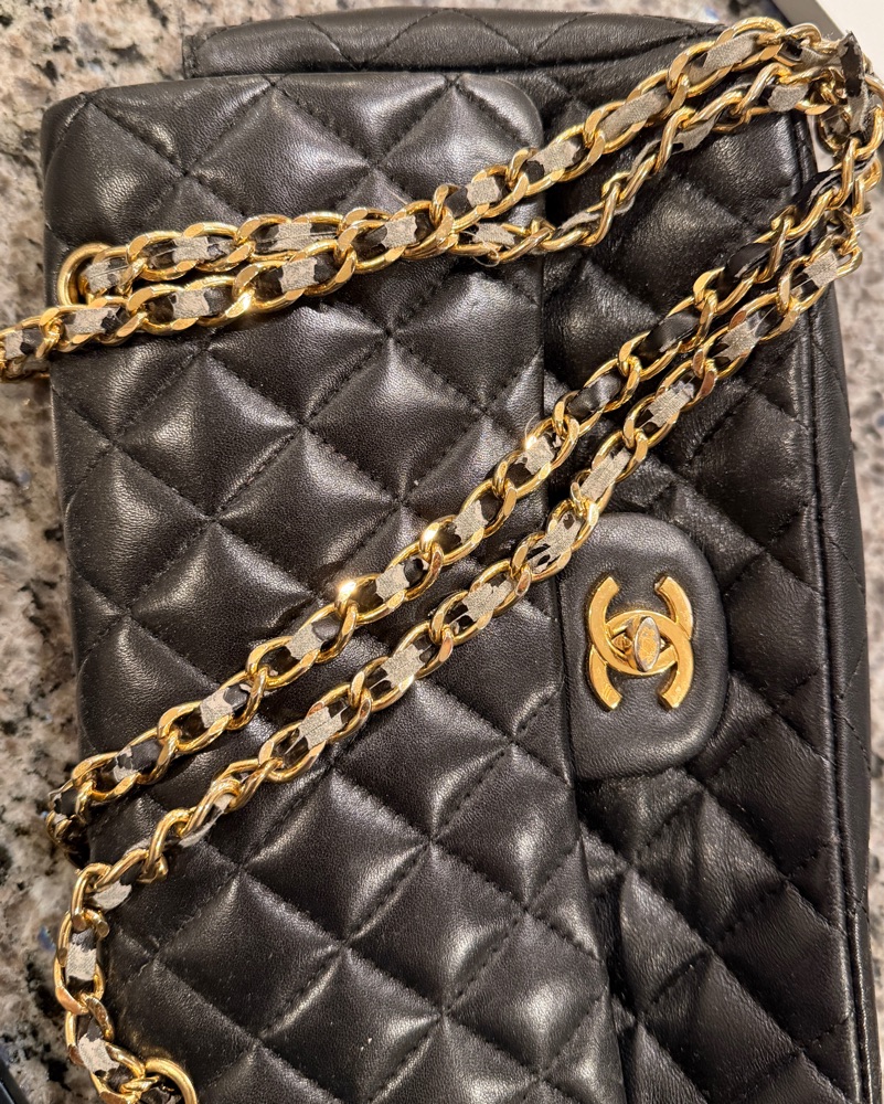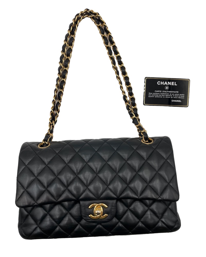 CHANEL Classic Double Flap Bag in black caviar quilted lamb skin leather and gold hardware. True Vintage showing signs of wear on the leather of the straps and interior. Stunning & elegant Classic Chanel handbag.