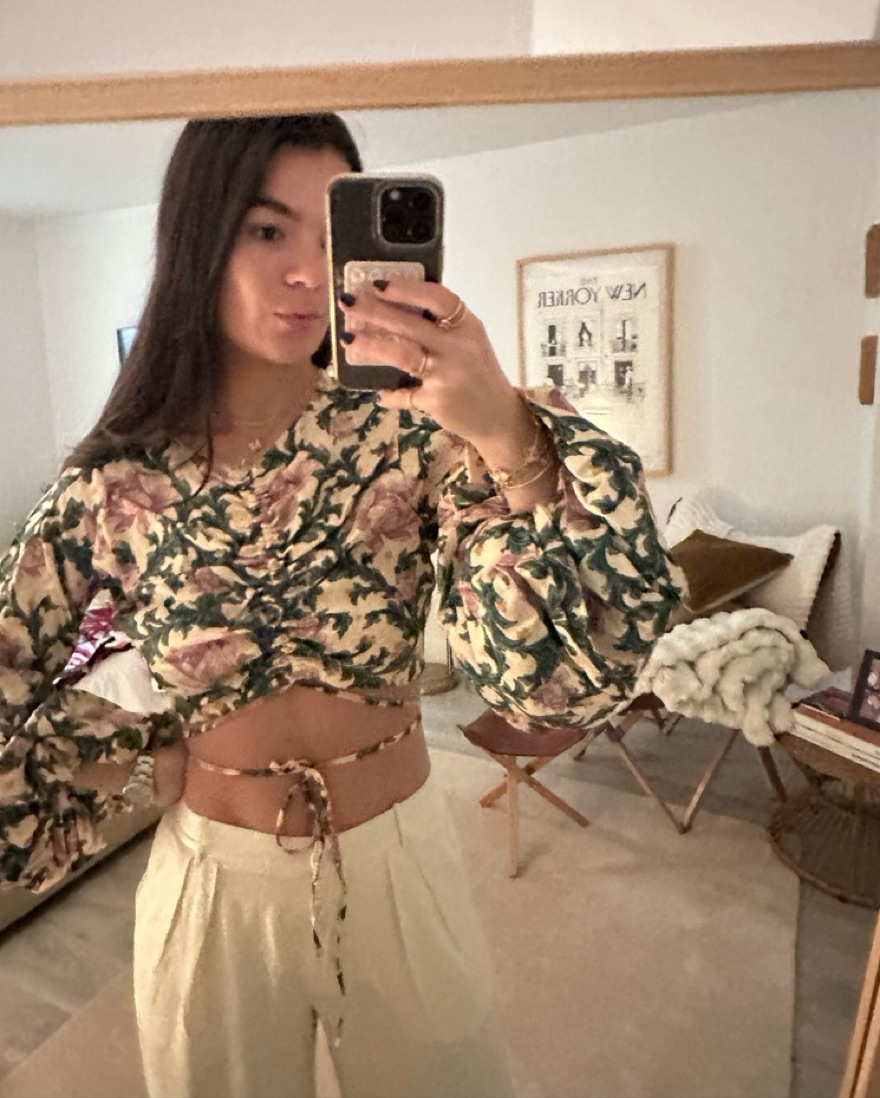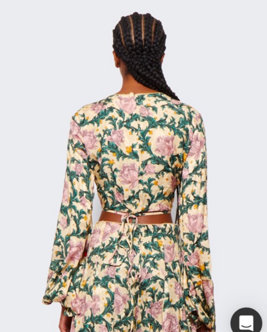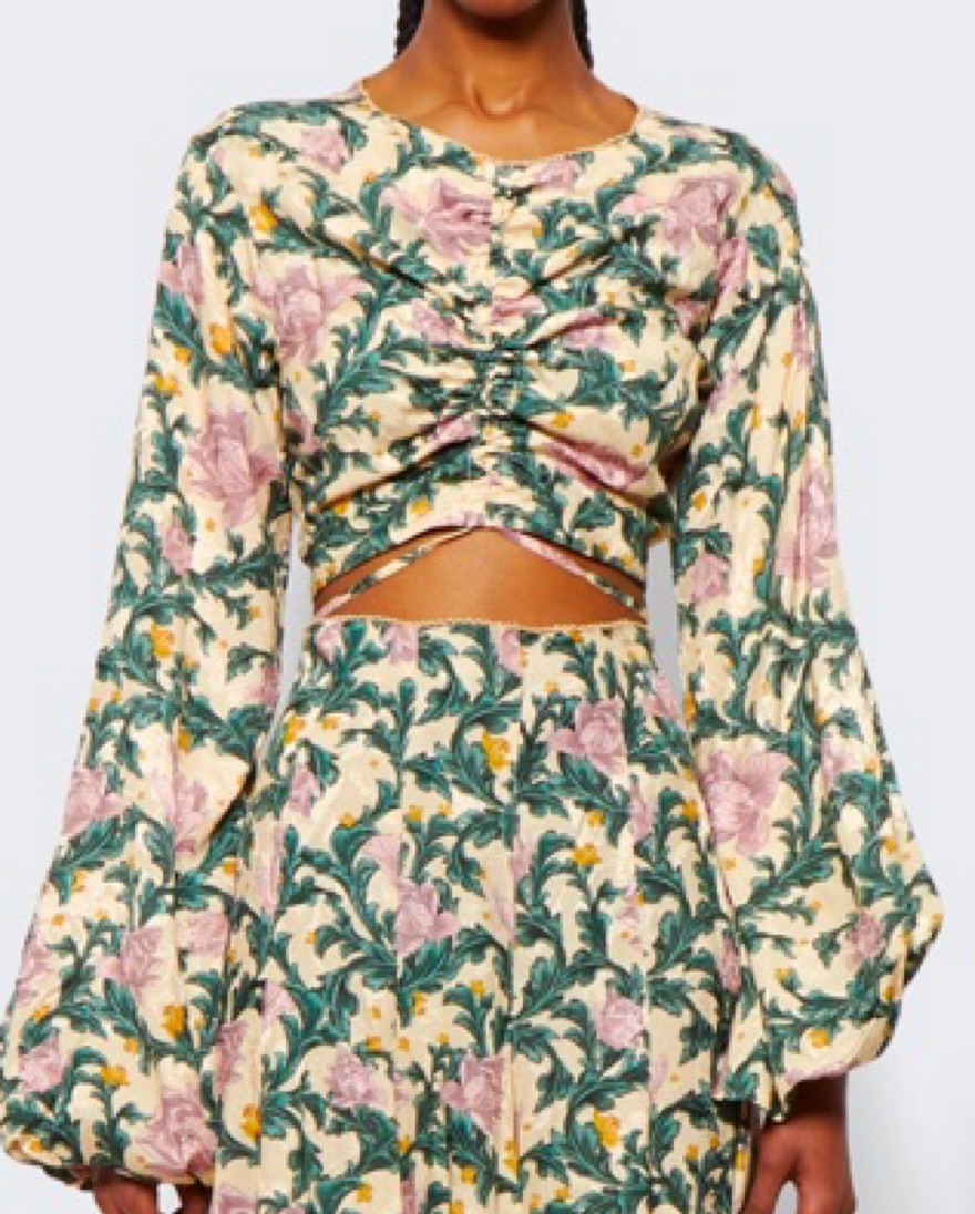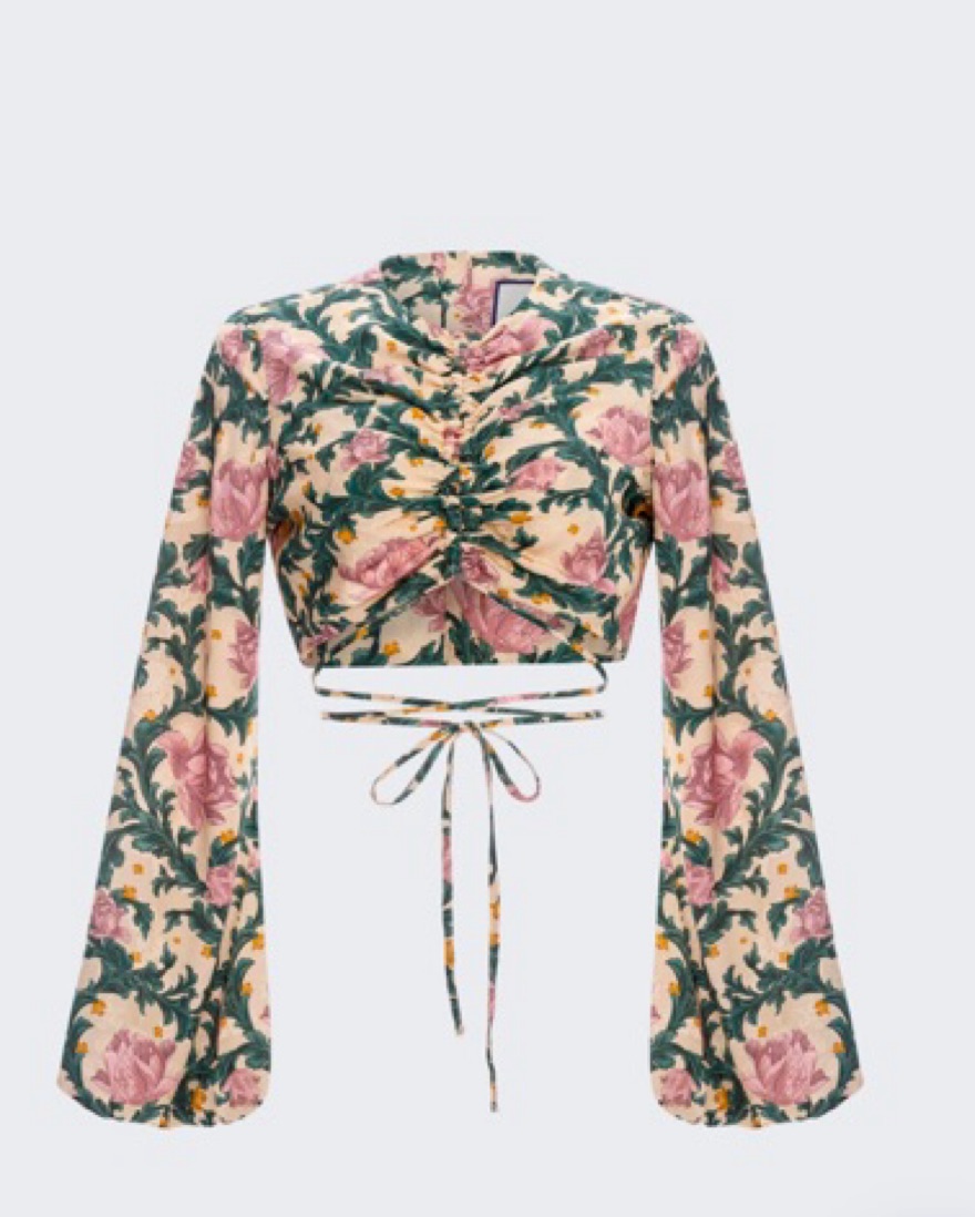 Cropped silhouette Long, oversized peasant sleeves Round neckline Self-tie straps at hem Front ruched details across the chest Concealed zip fastening on the side.