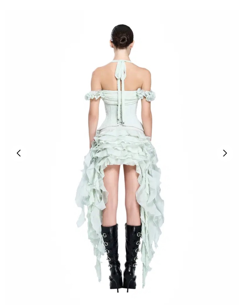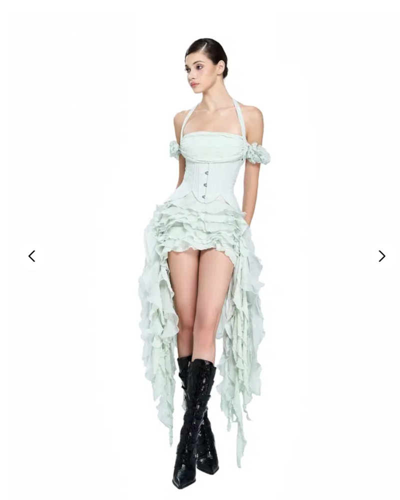 This halter dress is from the Vietnamese brand LSOUL features a flowing, ruffled skirt and a waist snatching matching corset. Fits sizes XS-S