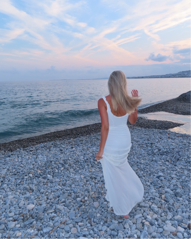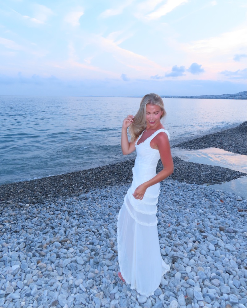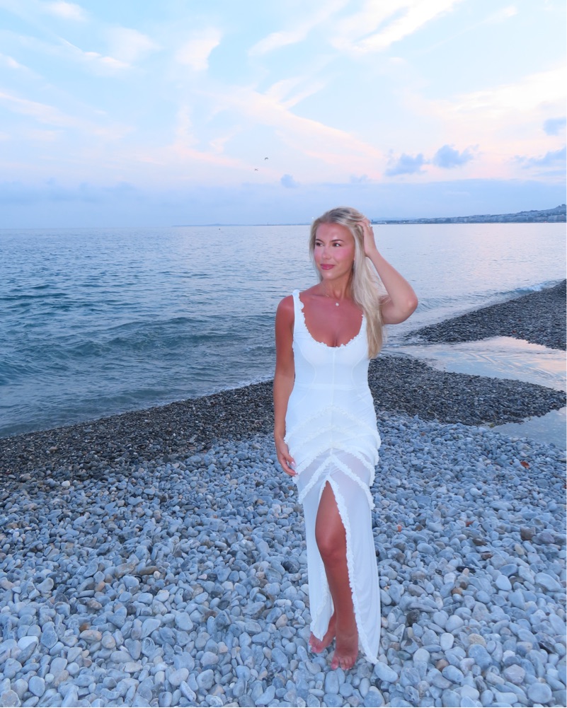 This stunning white maxi dress is perfect for a vacation getaway or elegant evening event. The flowing silhouette and scalloped details create a romantic and sophisticated look.