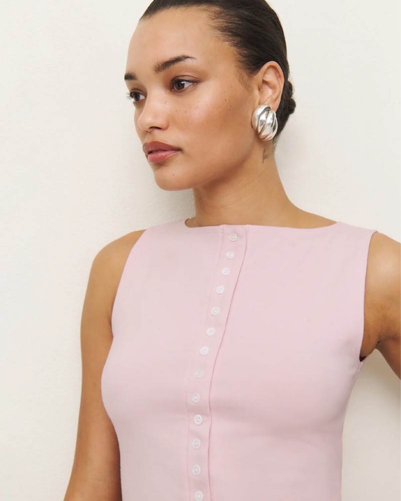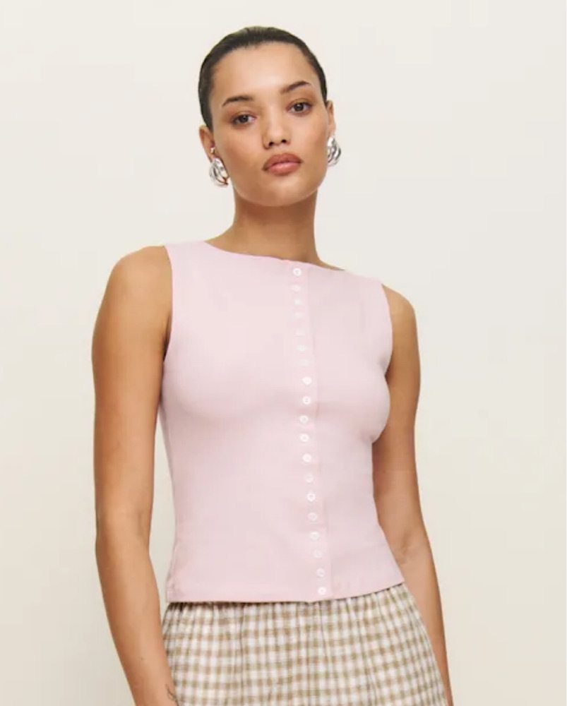 Up top. Shop the Julie Knit Top from Reformation, a sleeveless top with a high neckline and button front.