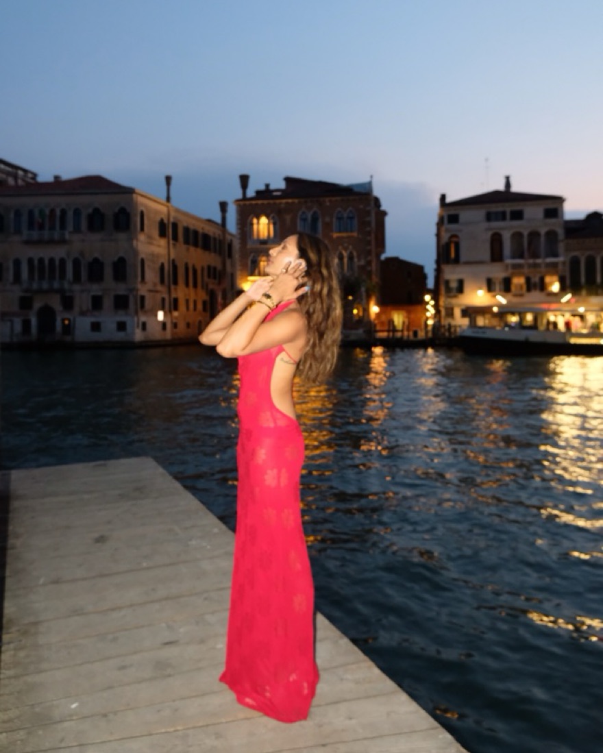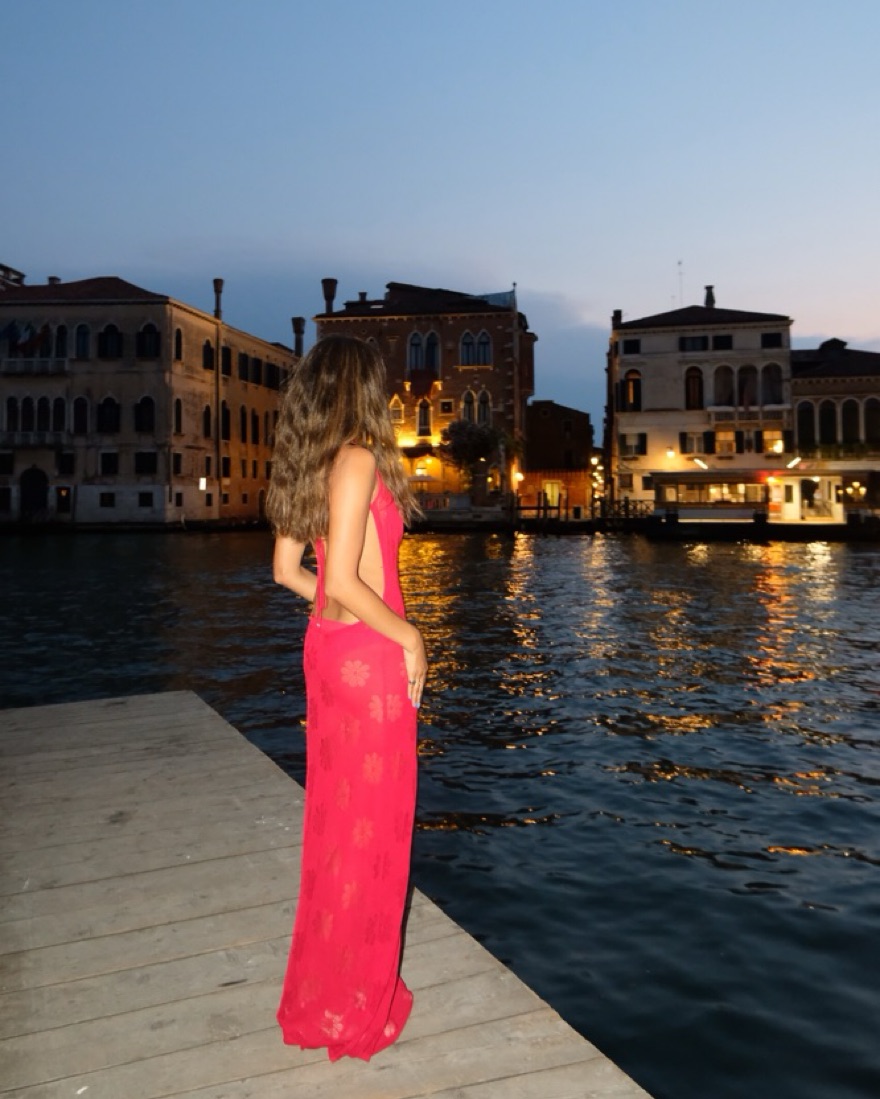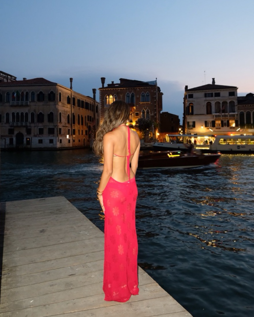 This captivating maxi dress in a vibrant red hue is perfect for a romantic evening stroll along the canals of Venice. The open back design adds a sultry touch, perfect for strutting through the historic streets.