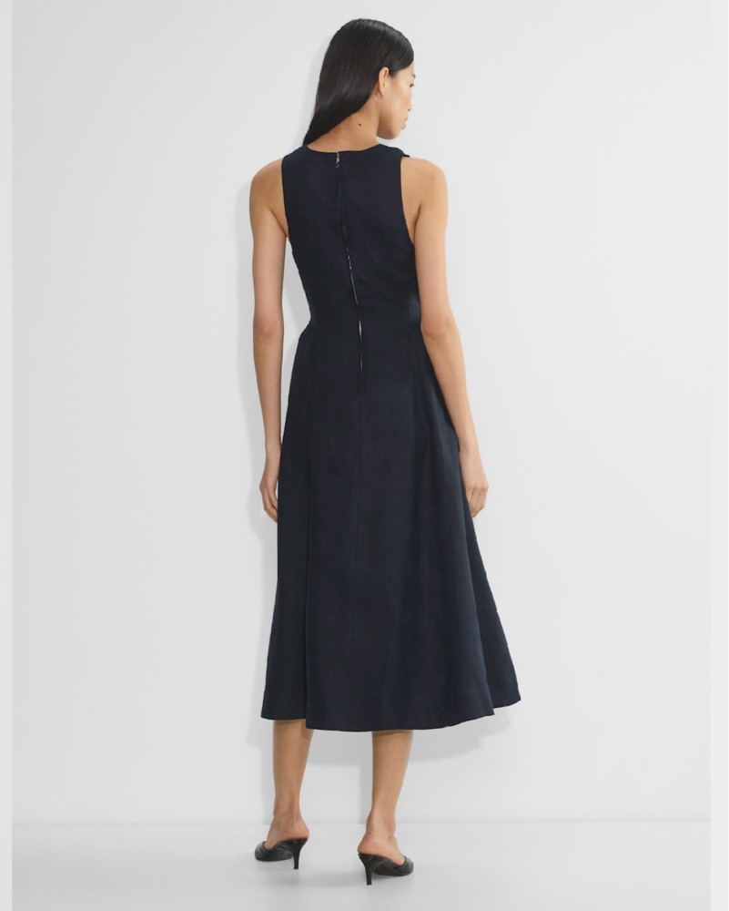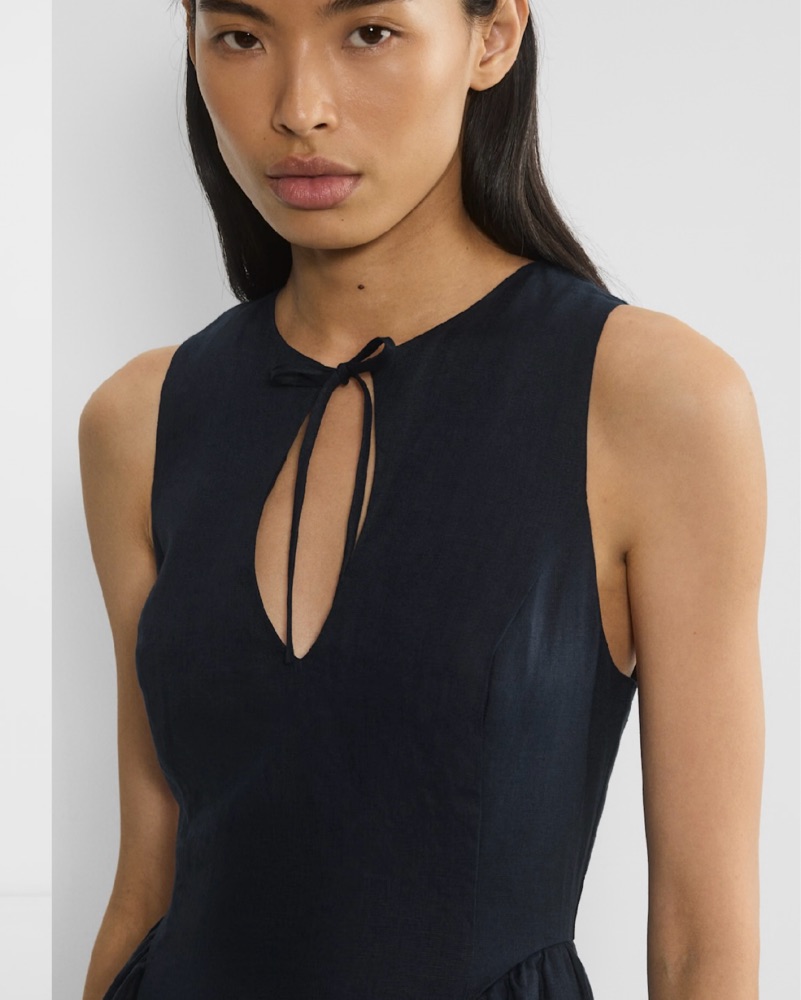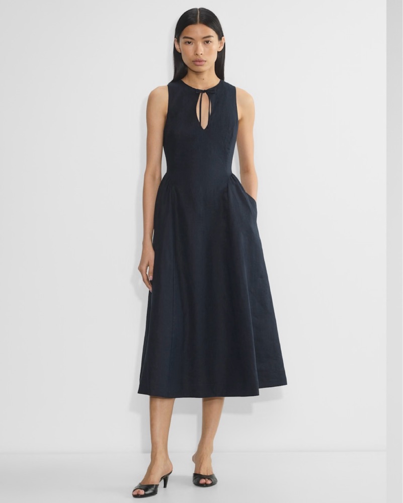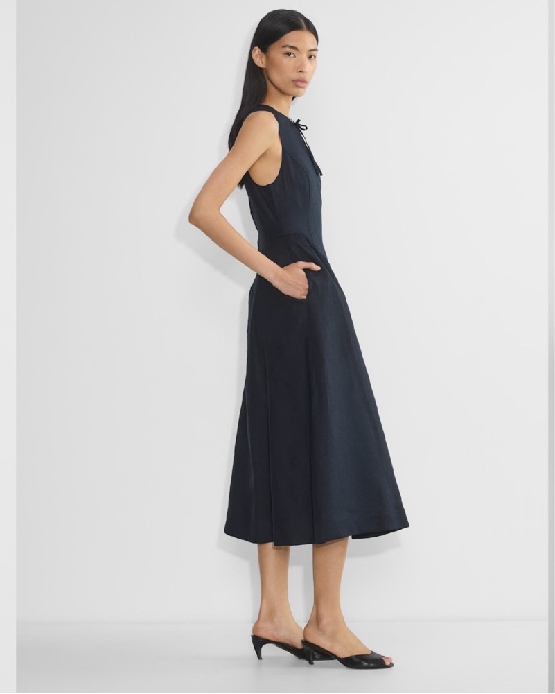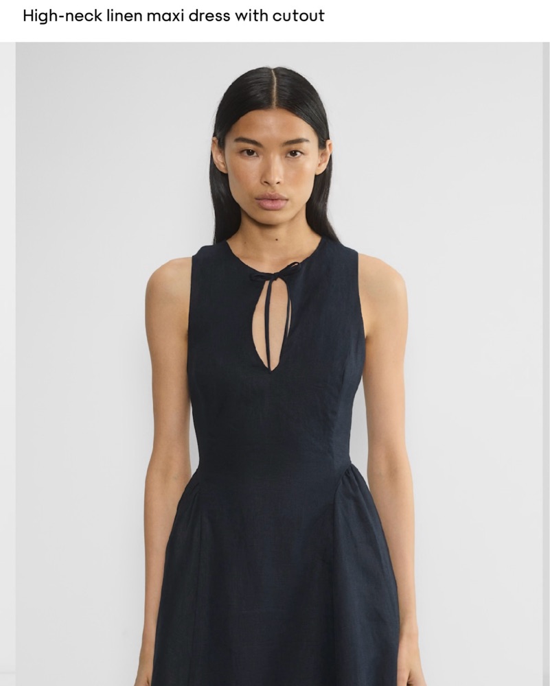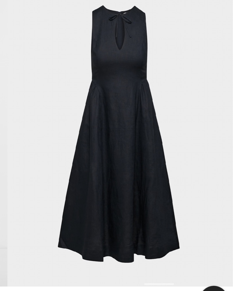 Aritzia Wilfred “Countess” dress. Fit and flare with a cutout detail and tie at the neckline. Color is “Dark Night Navy.” 100% organic linen. The fit of this dress is super flattering, it’s absolutely gorgeous on and such a perfect piece for summer! Please dry clean before returning.