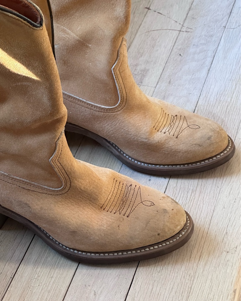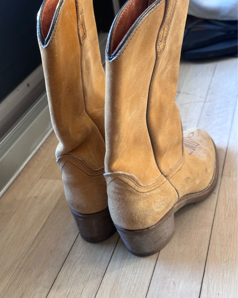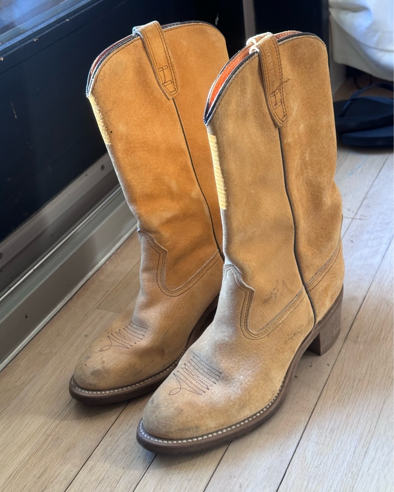 Perfectly worn in vintage suede cowboy boots - hit around mid - calf fits size 7.5/8