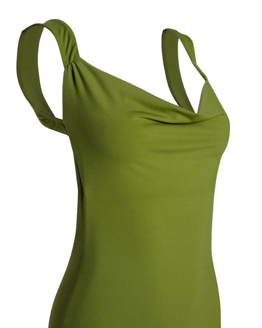 verdant maxi dress with scoop cowl neck, low back, and bodycon fit, made in a fully lined, non-sheer fabric, with pull-on construction