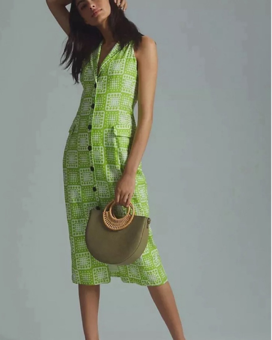 linen blend, midi, summer button down dress with pockets. green and white pattern. super chic, old money aesthetic, sexy, comfortable. Ideal for summer picnics, brunch, winery, dates.