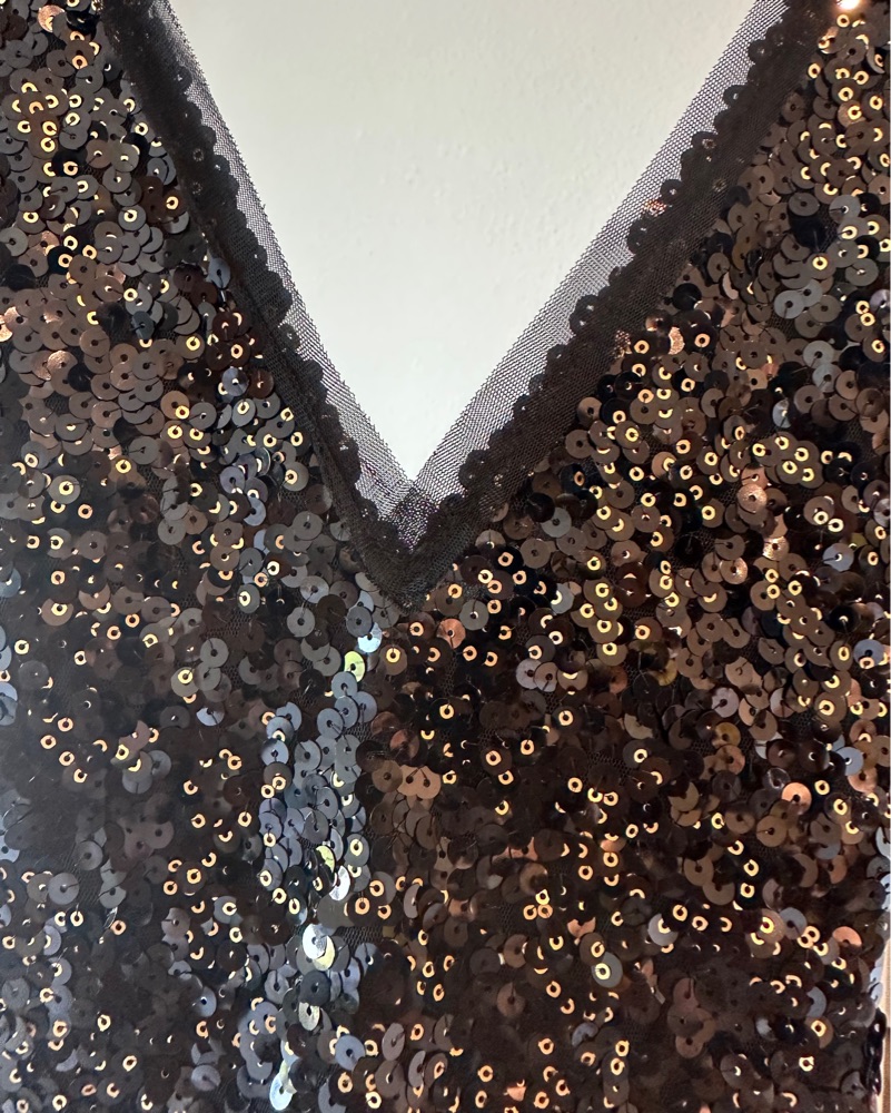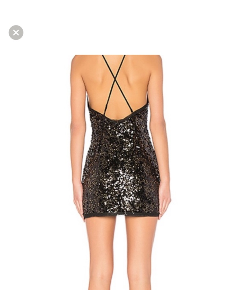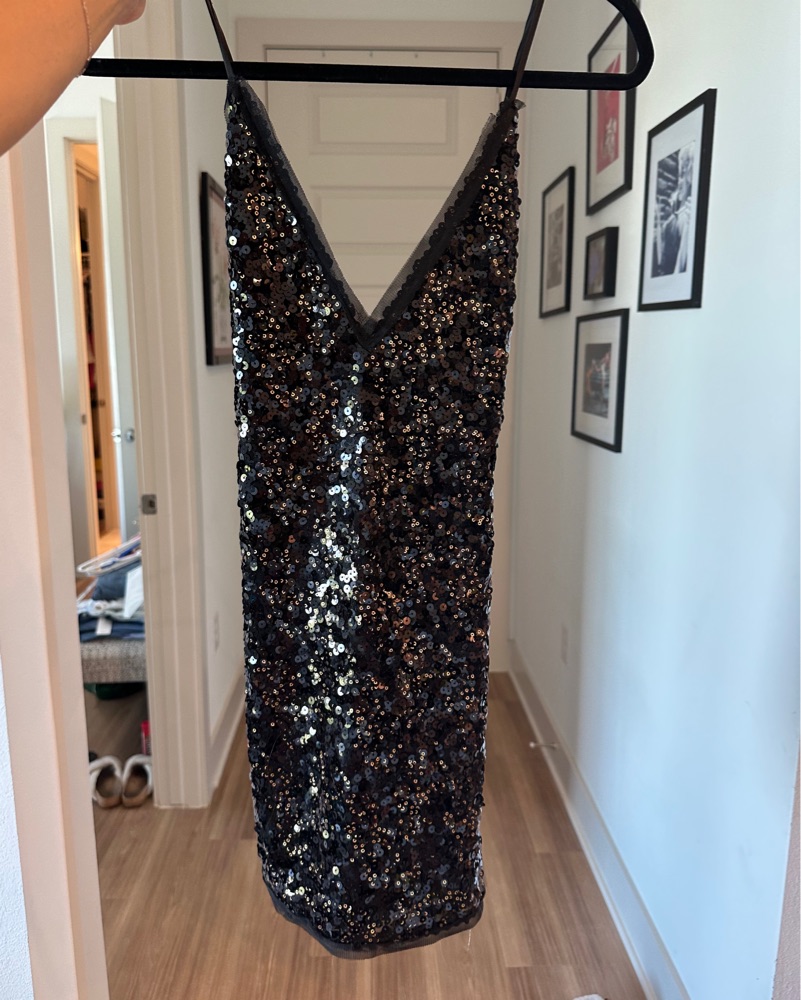 A show-stopping black/gold sequin mini dress perfect for a night out on the town. The eye-catching design is sure to turn heads. Worn twice in perfect condition! Fits a xs/small