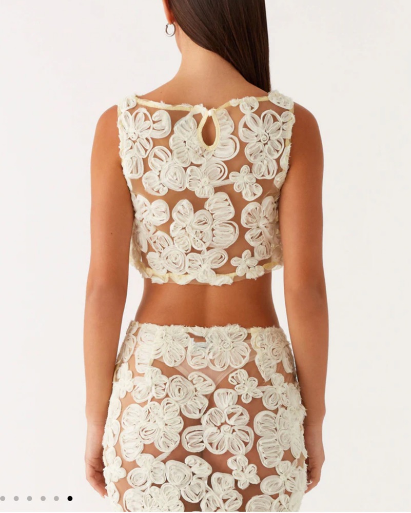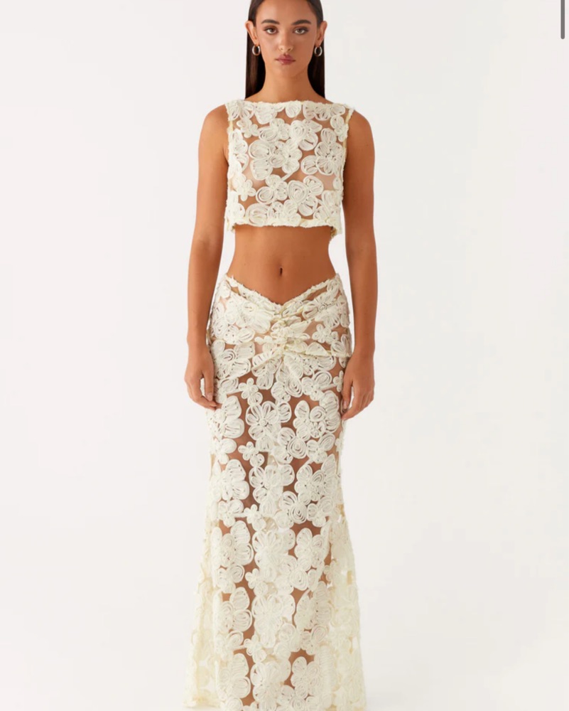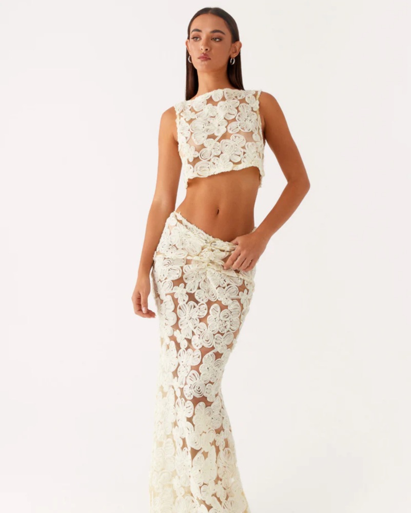 This stunning ivory set features intricate floral lace detailing, creating a chic and romantic look perfect for a formal event or wedding guest attire.