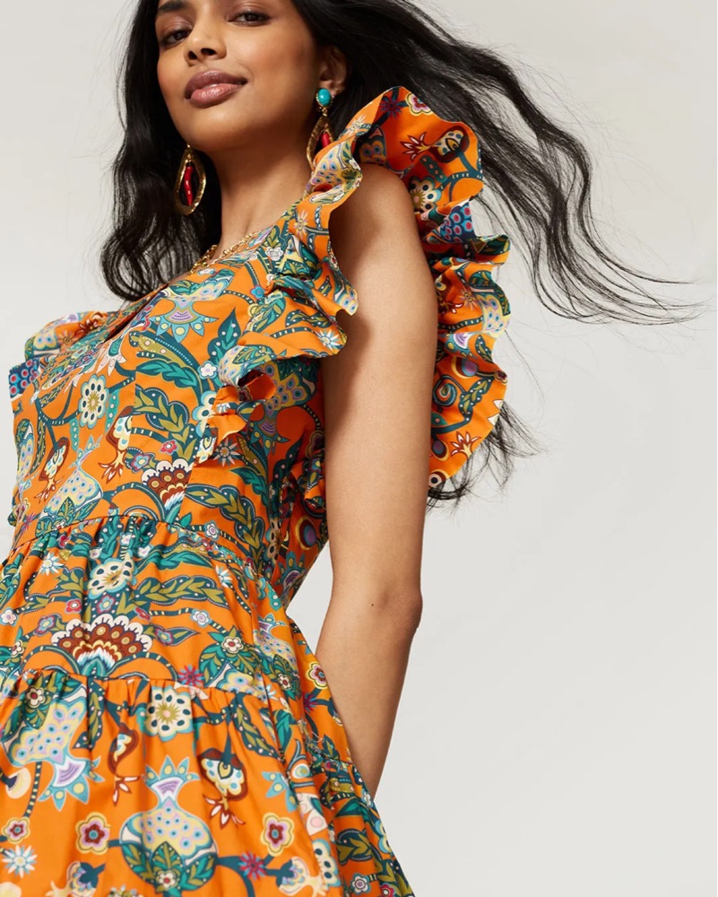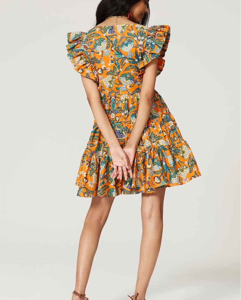 This eye-catching mini dress is perfect for a summer garden party or outdoor event. The ruffles and bold floral print add a playful, feminine touch. It works well for wedding Friday night, coastal cocktail, Italian vacations and more!