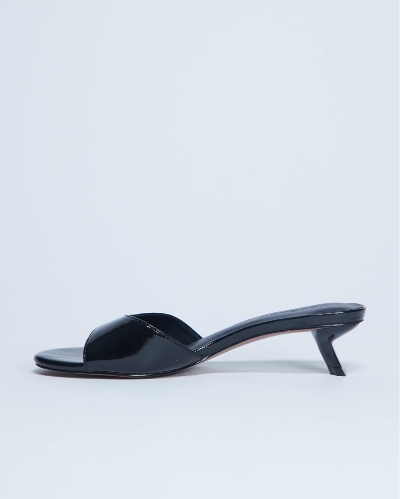 These classic patent leather slide sandals are perfect for a night out or dressed up daytime look. The low kitten heel adds a touch of sophistication.
