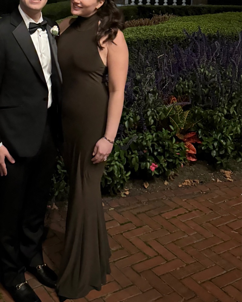 Jersey material, chocolate brown, floor length, halter gown, true to size but the material is stretchy so could fit a size medium or large