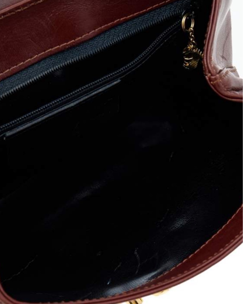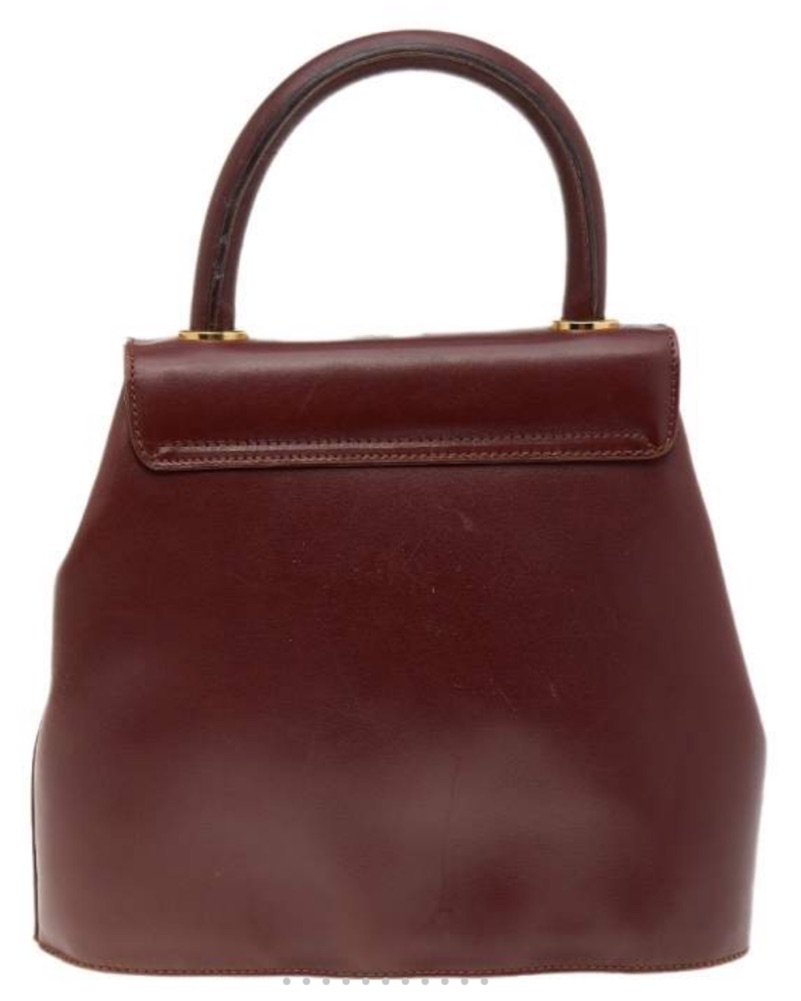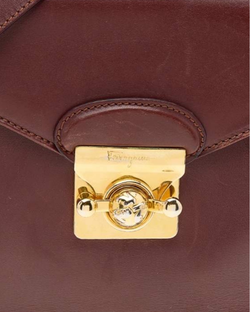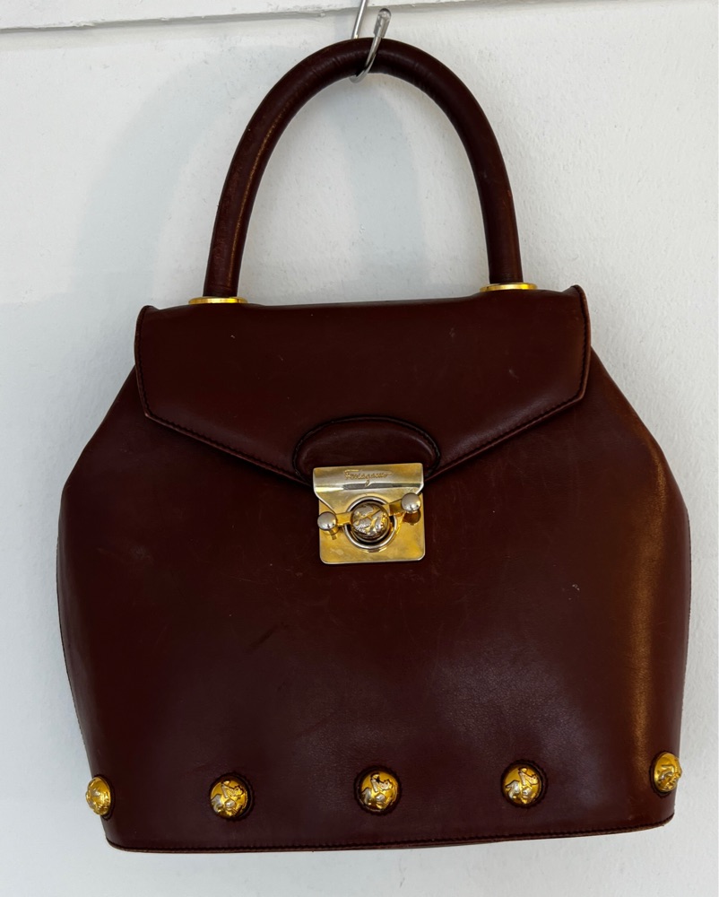 Vintage Salvatore Ferragamo burgundy leather top handle bag with gold stud details and structured satchel shape. Features a front lock closure and classic top handle. Timeless statement bag perfect for dinners, events, or a night out.