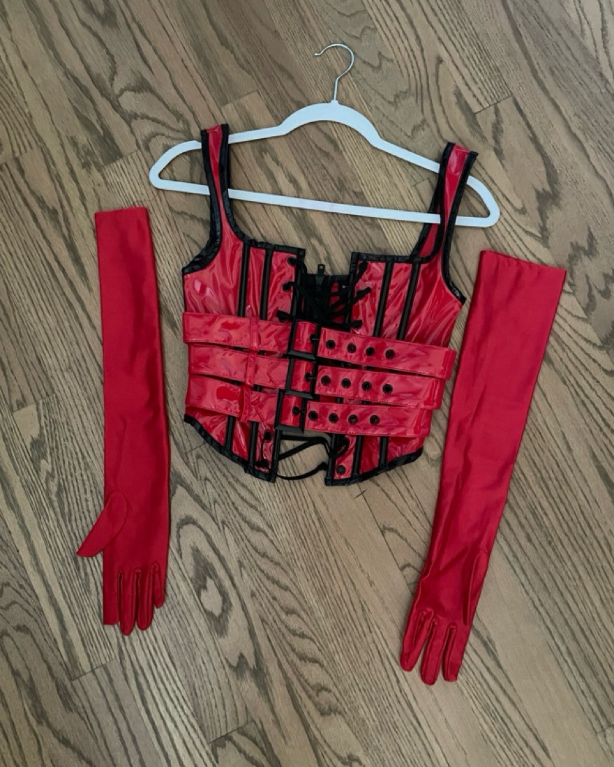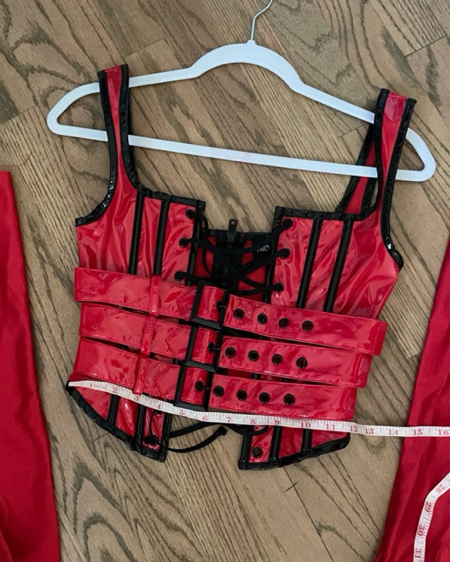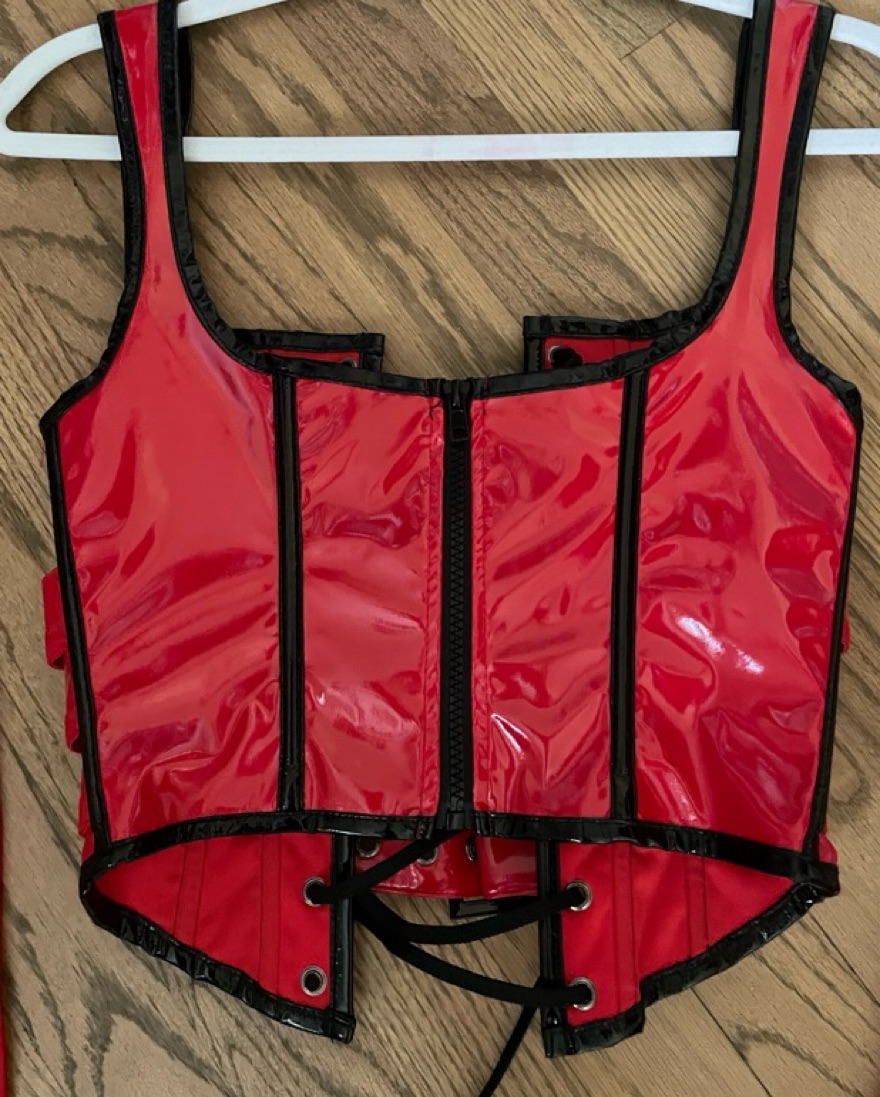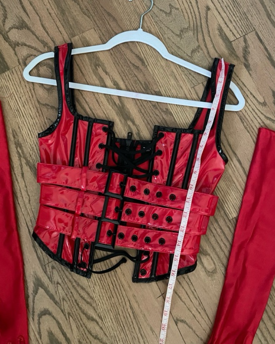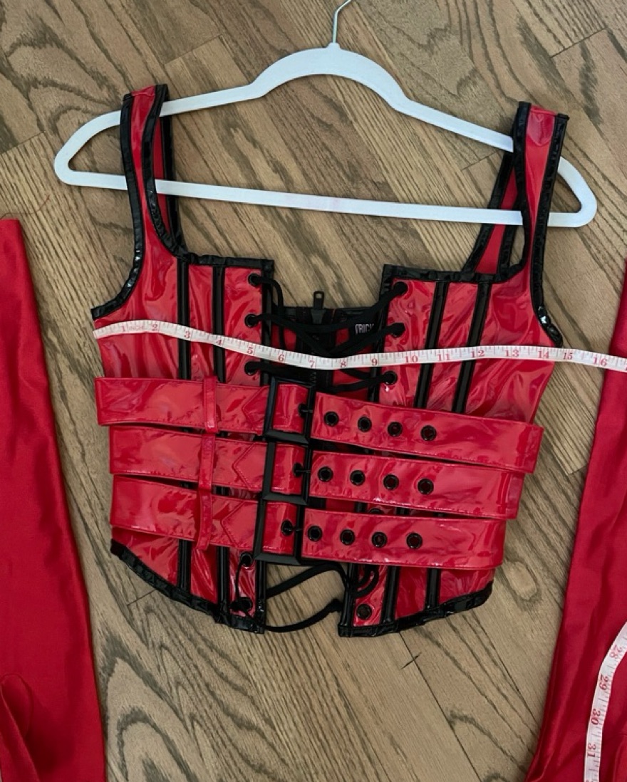 Dolls Kill Trickz N’ Treatz red corset halloween costume. Comes with red gloves. Does NOT include bottoms. Perfect condition. Adjustable lace up and buckel front. Zip back closure. 100% Polyurethane. Halloween costume. Size XXS. See photos for measurements.