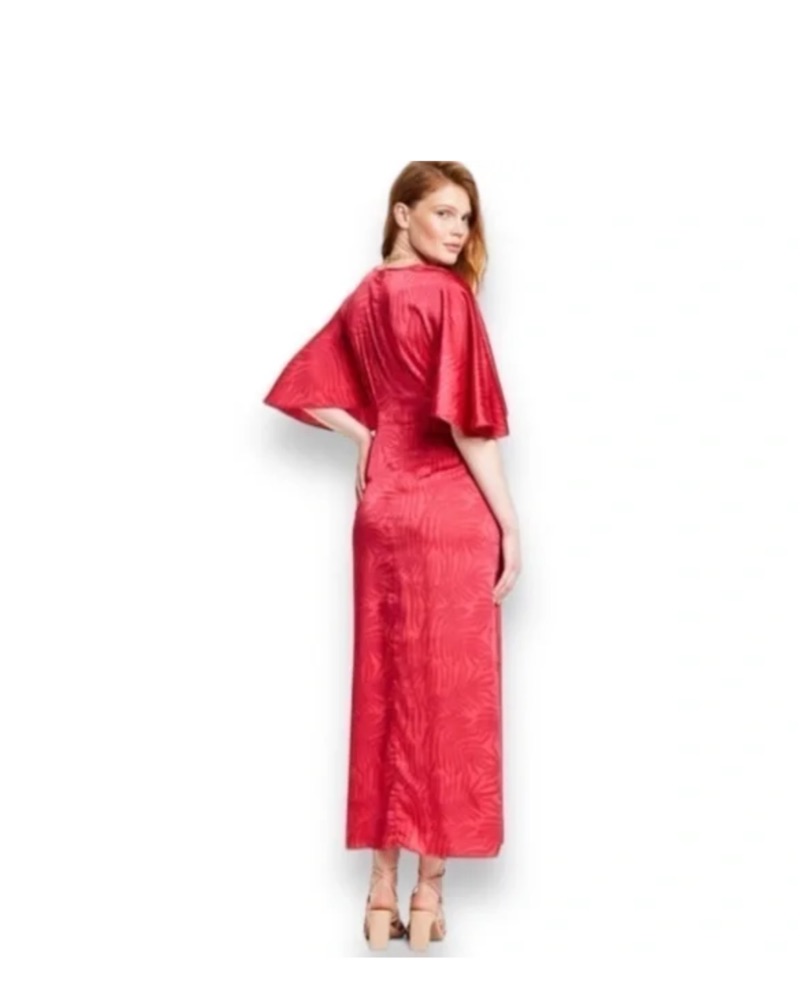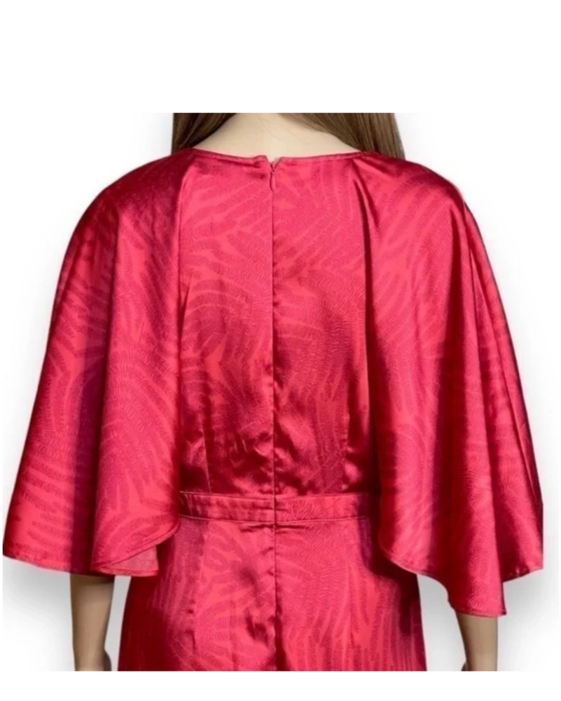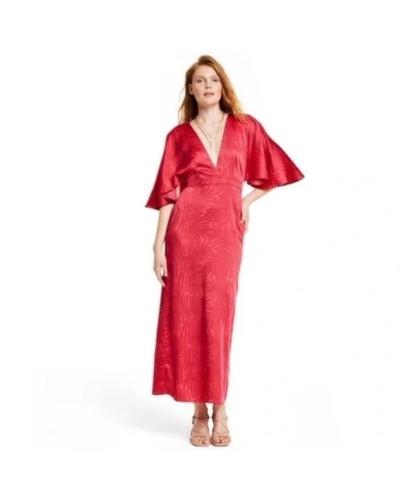 This stunning red satin dress is perfect for a formal event or a night out on the town. The flowing maxi silhouette and dramatic cape sleeves create a captivating, elegant look.