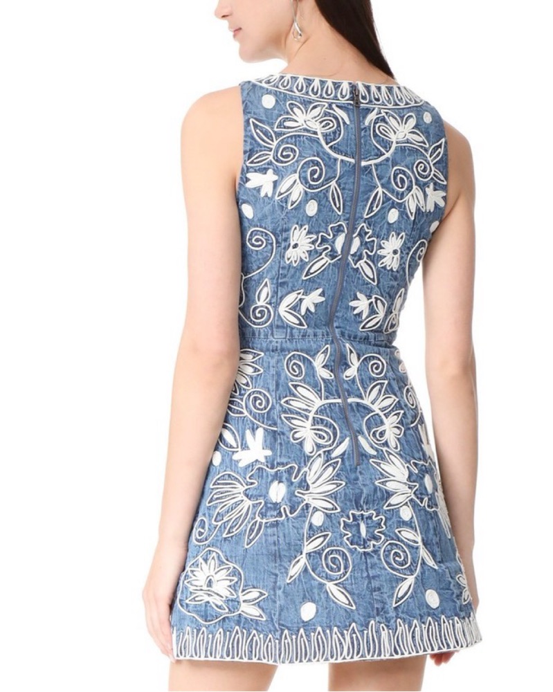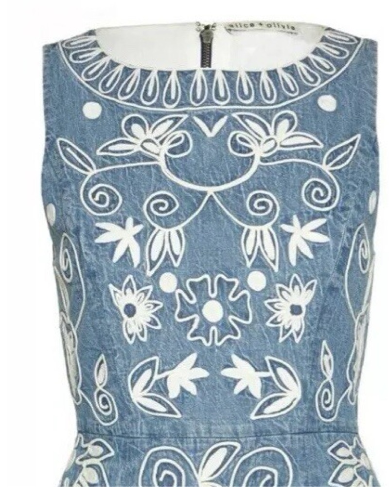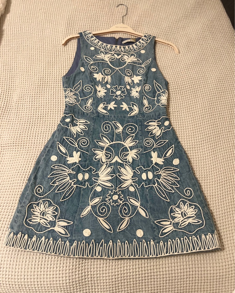 White embroidery on a denim dress from the designer Alice and Olivia fits women’s size small great for dressing up or down