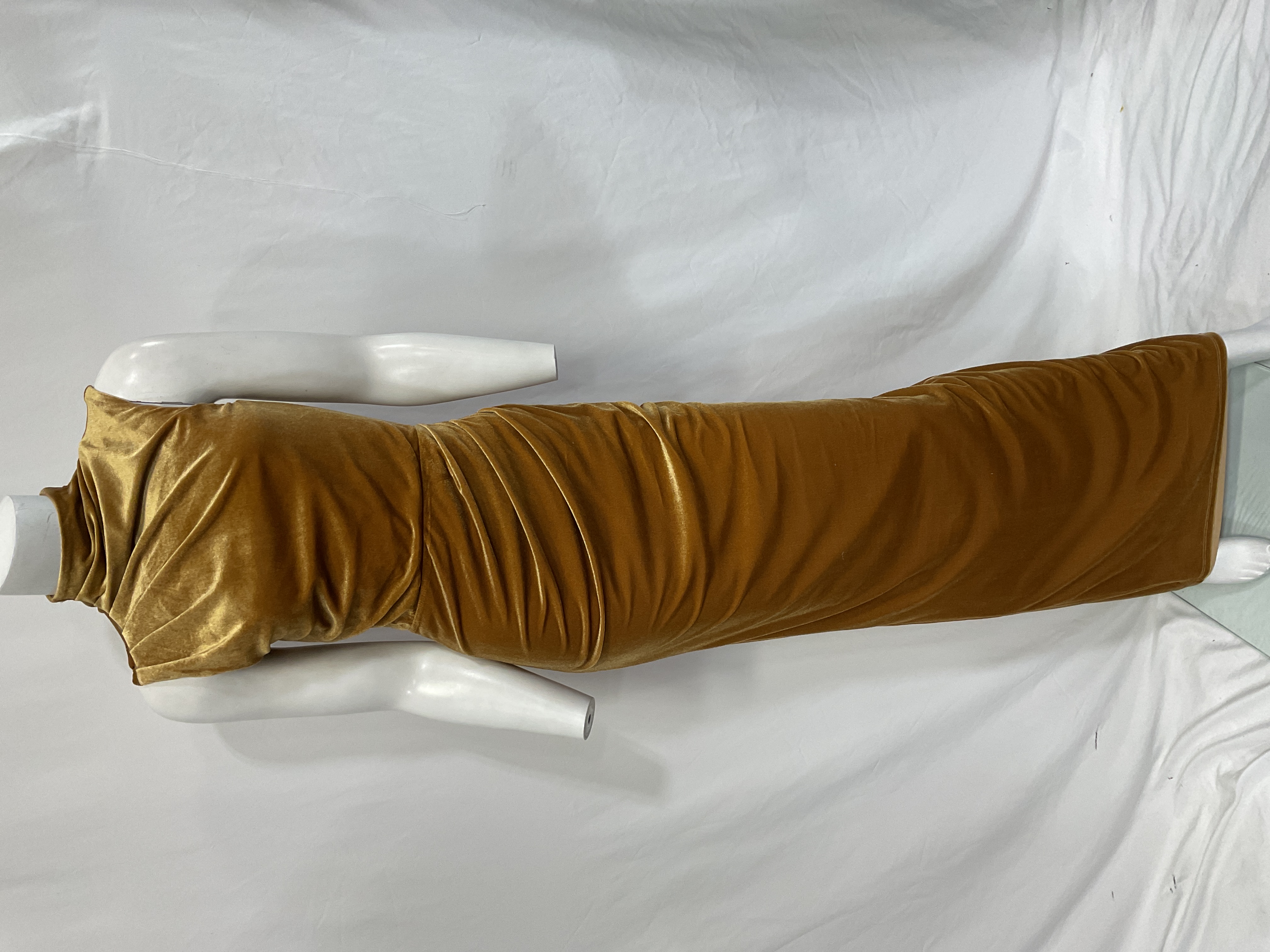 Stunning gold shimmer makes this a showstopper for weddings and special events. Figure-hugging silhouette with a dramatic floor-length hem turns heads effortlessly.