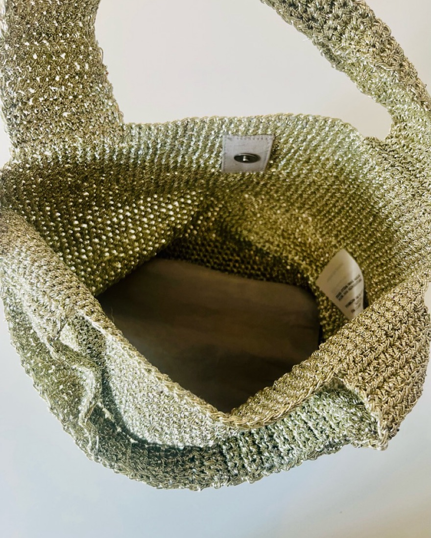 This is a silvery metallic crochet purse. Could be dressed up or down.
