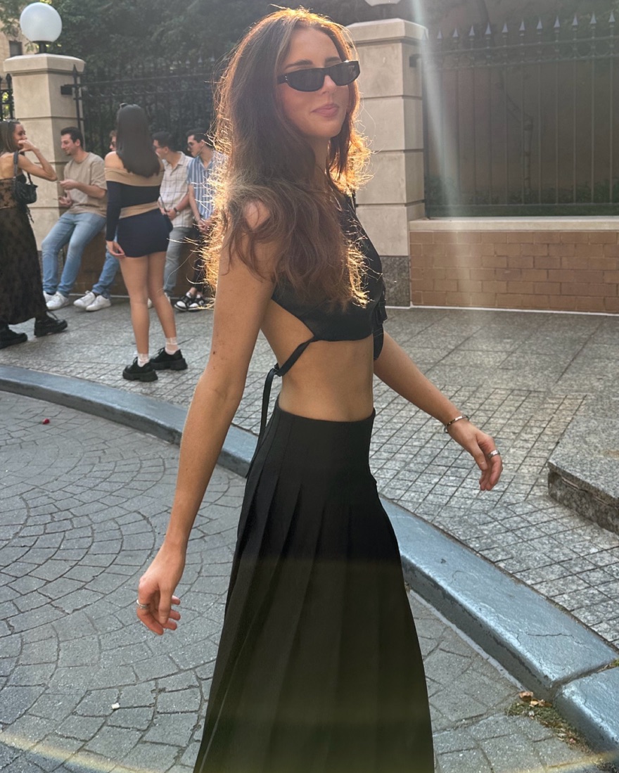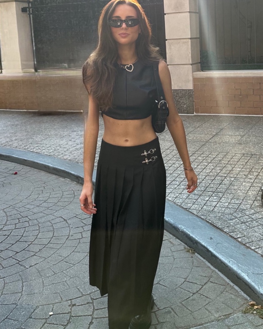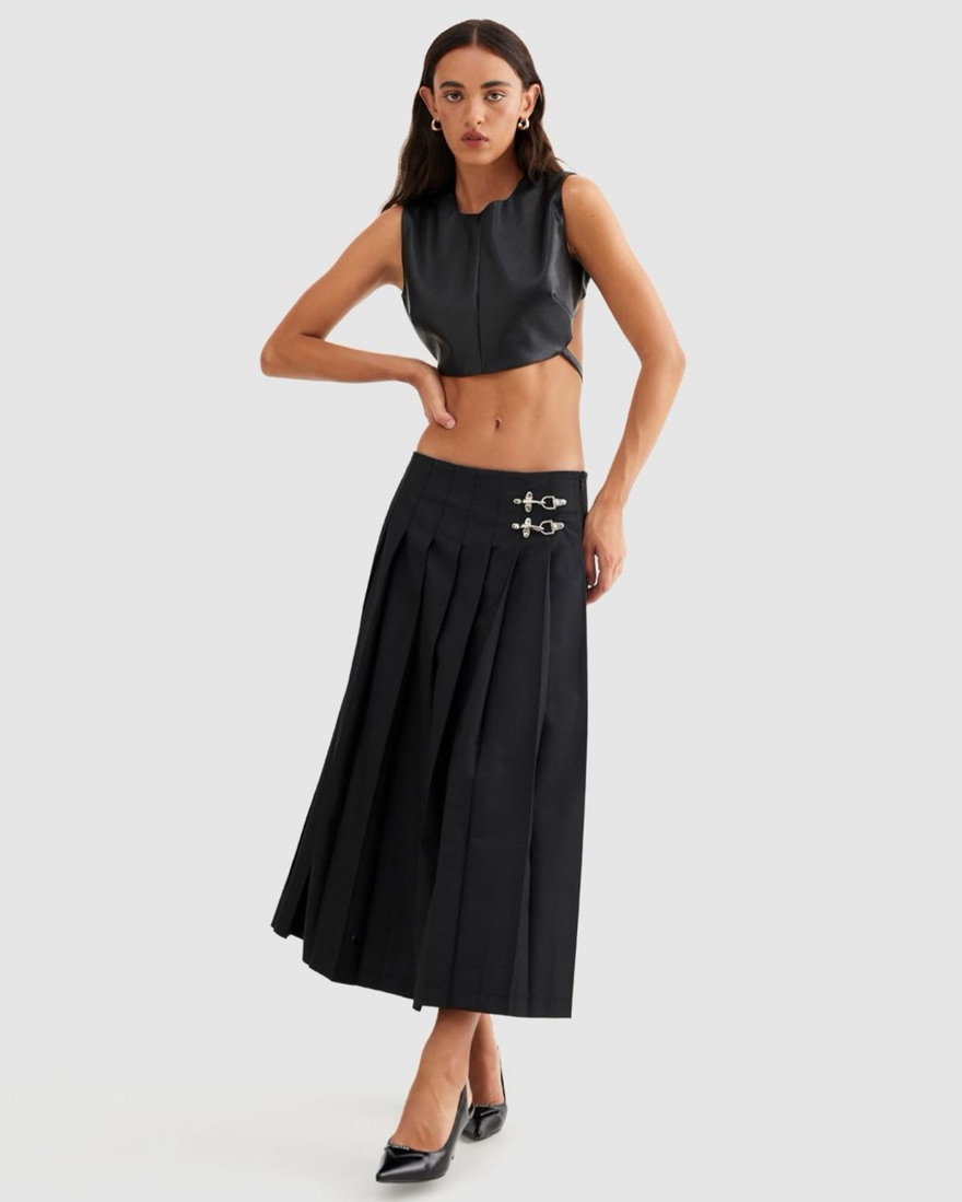 JUST THE SKIRT - Can be rented as the set! Fabric: Mid-weight, non-stretch twill. Pleated details. Double lobster claw closure at hip. Side zip. Shell: 80% polyester/20% viscose. Hand wash. Imported, China. Measurements: Measurements from size S Length: 32.25in / 82.0cm