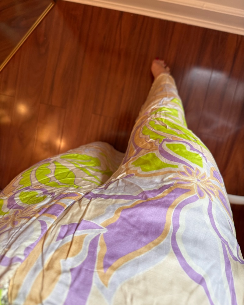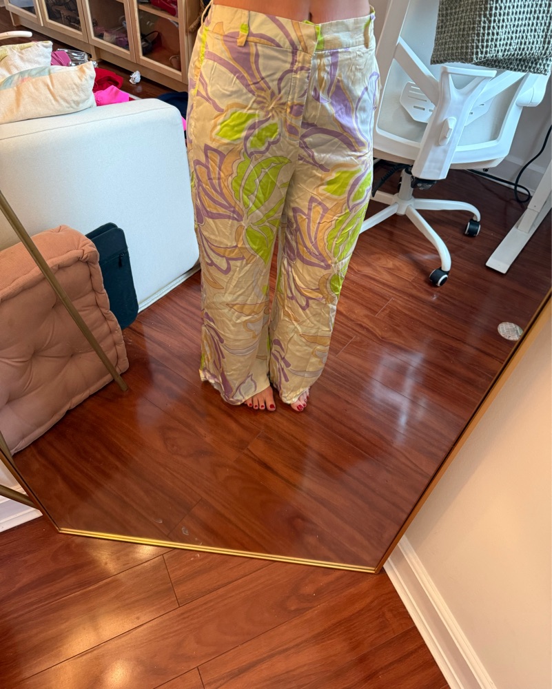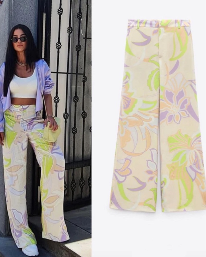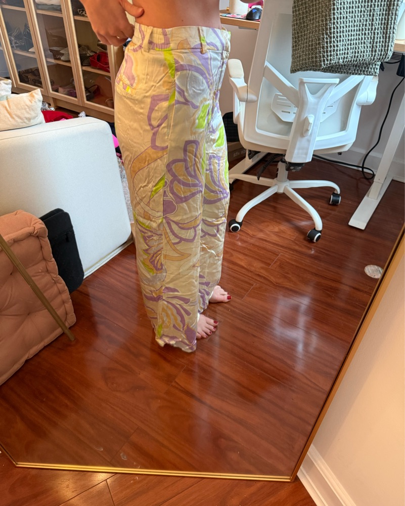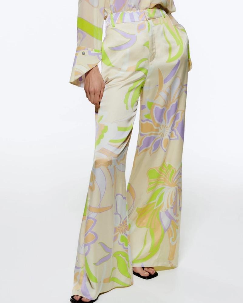 Zara pants satin. 70s inspired. Size medium would fit small to medium. I am size small here and 5’5. 70s. Costume. Palm Springs pants. Floral pants