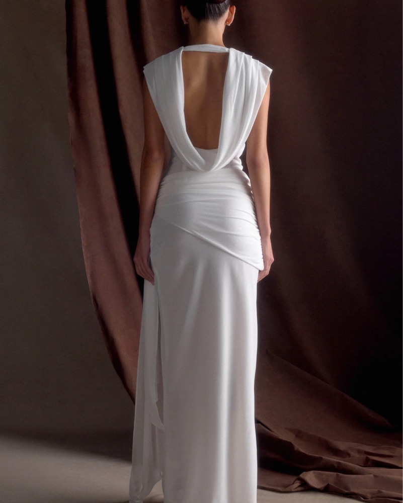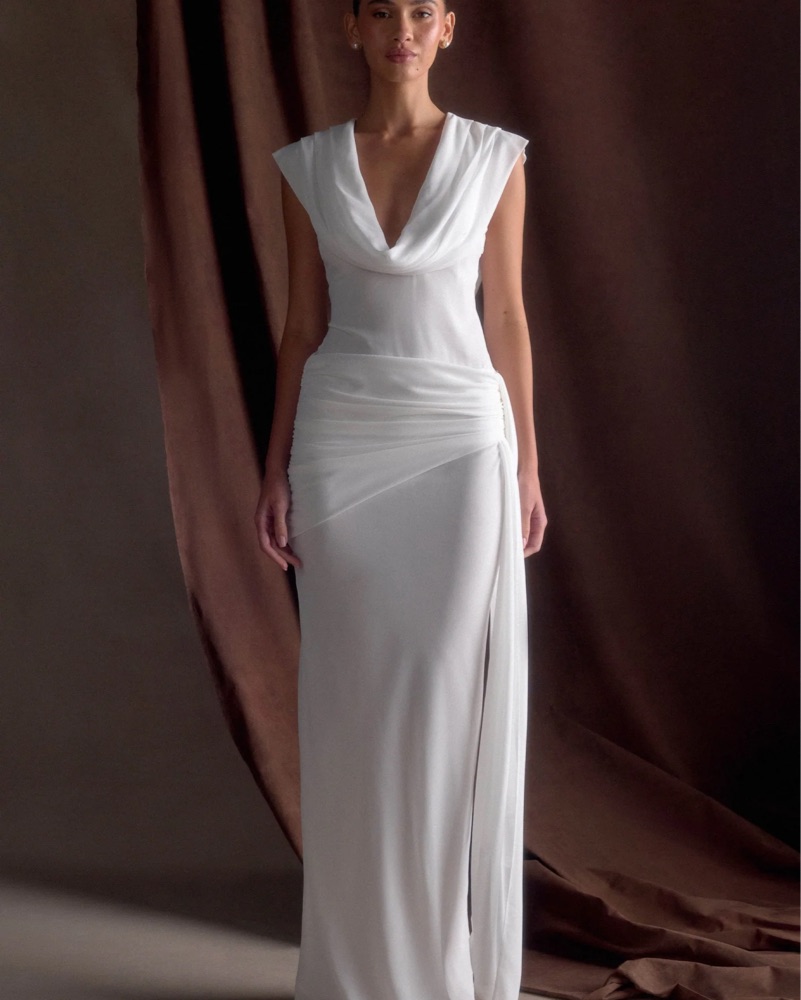White gown- xxs- The GIULIA Chiffon Draped Maxi Dress is a breathtaking display of fluidity and grace. Designed with a deep cowl neckline at both the front and back, this silhouette drapes effortlessly for a touch of timeless allure. The fitted waist creates a flattering shape, while the gathered ov