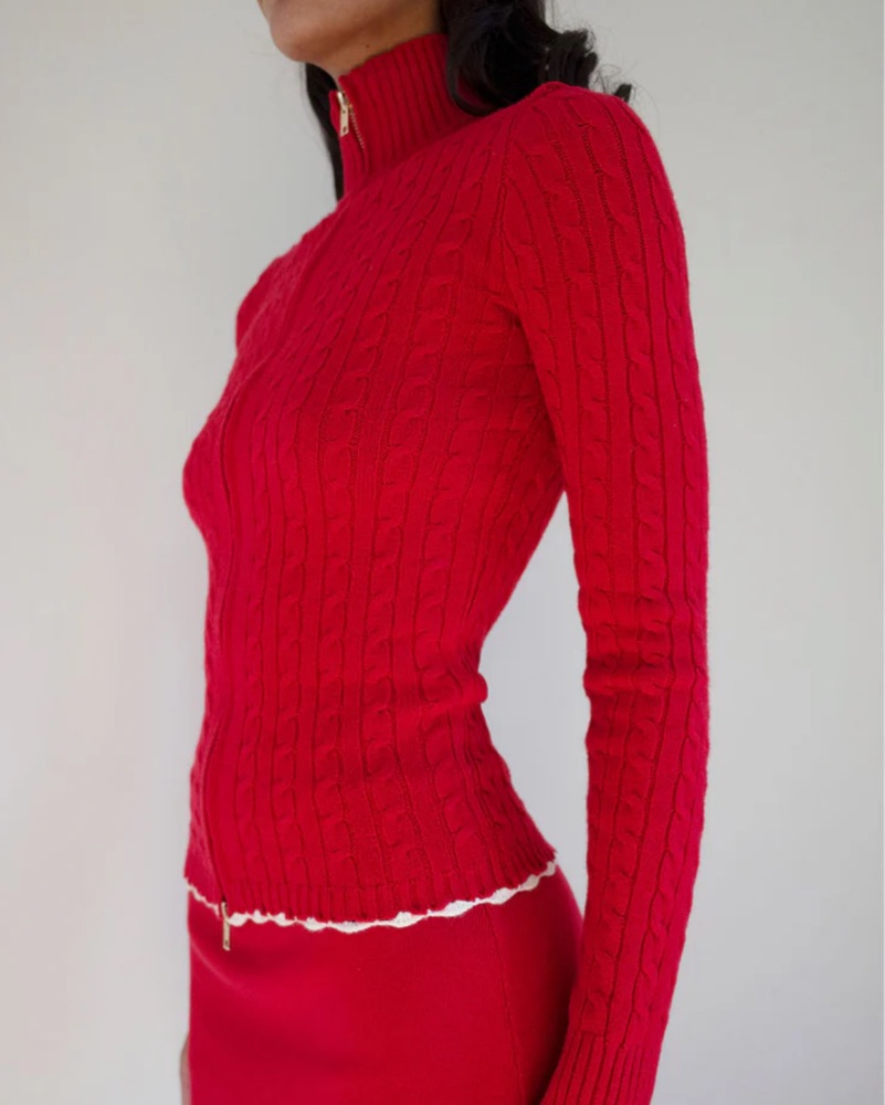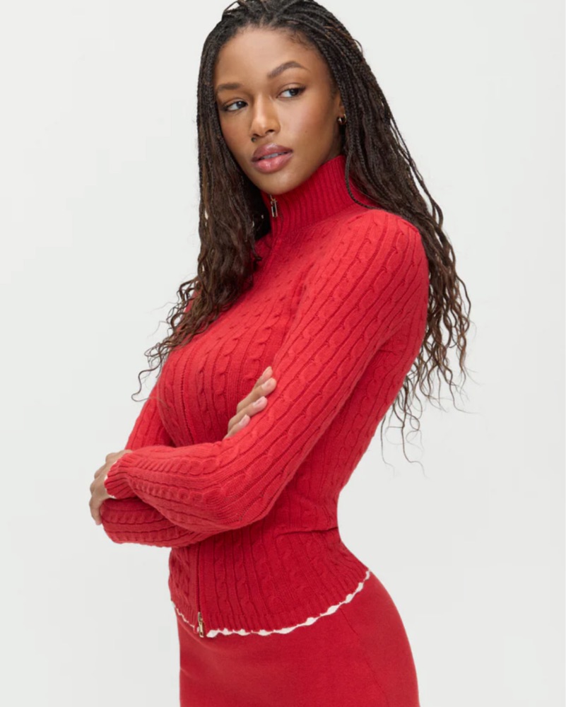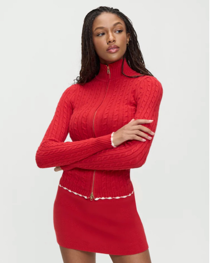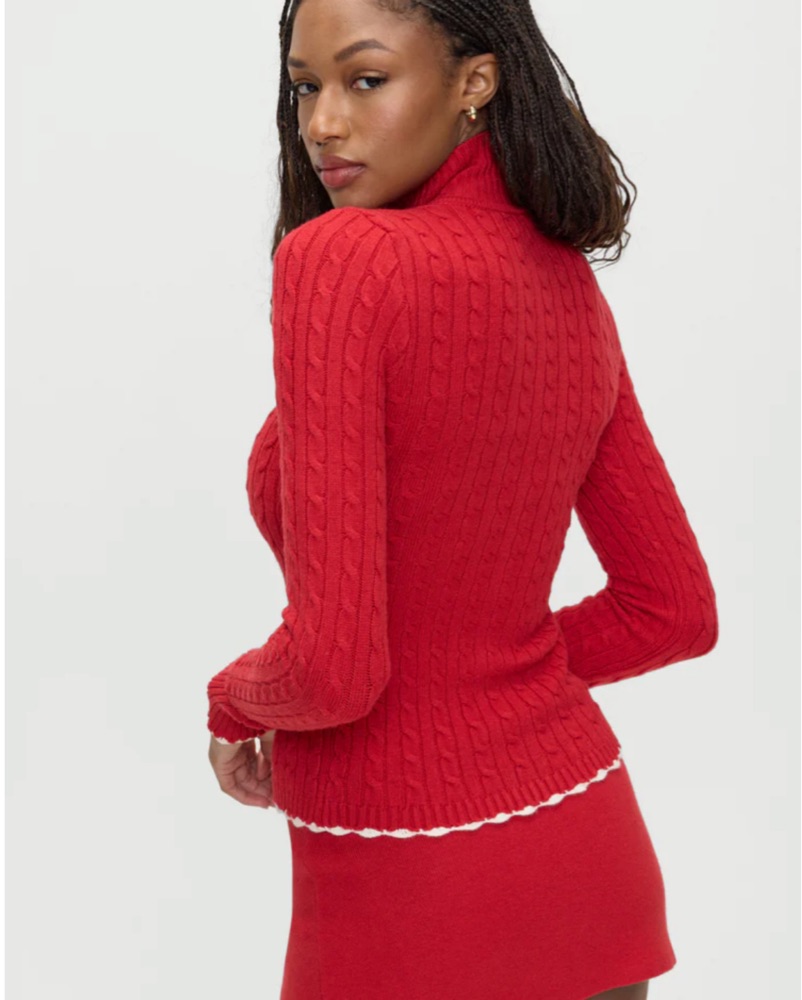 Frankie’s Carter Cable Knit Sweater and Marialla Mini Skort set in heartstrings red. Sweater is size XS, skort is size S