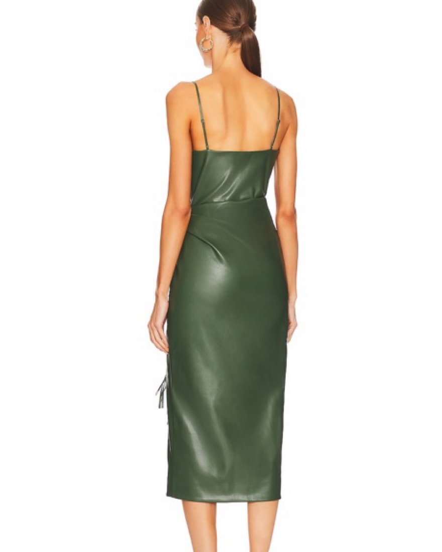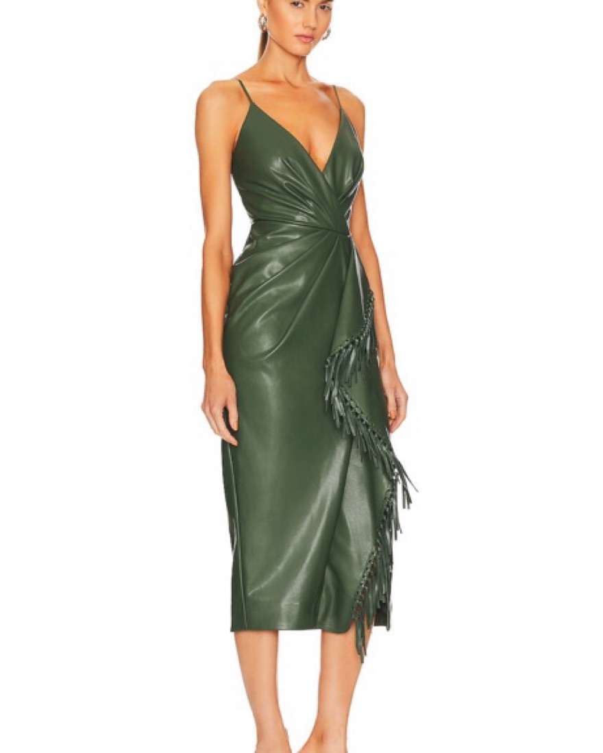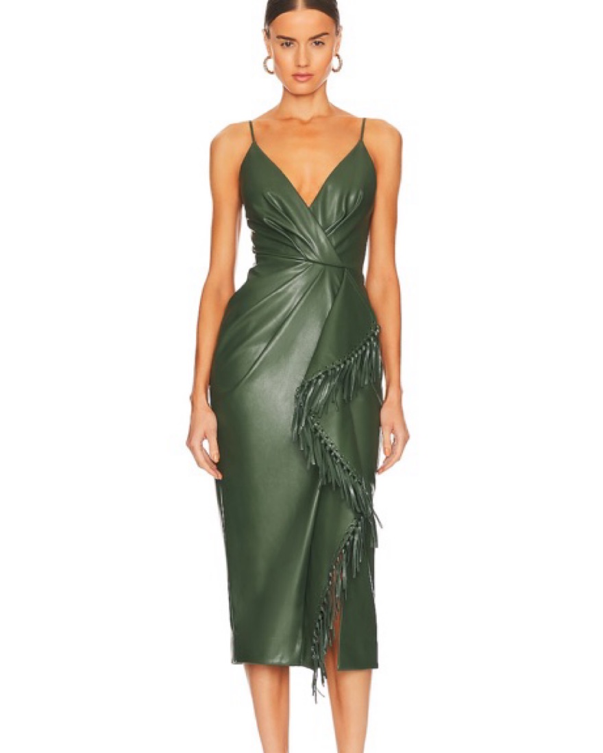 Green vegan leather midi dress with fringe. The best Aspen or country vibe. Pairs well with heels or cowboy boots.