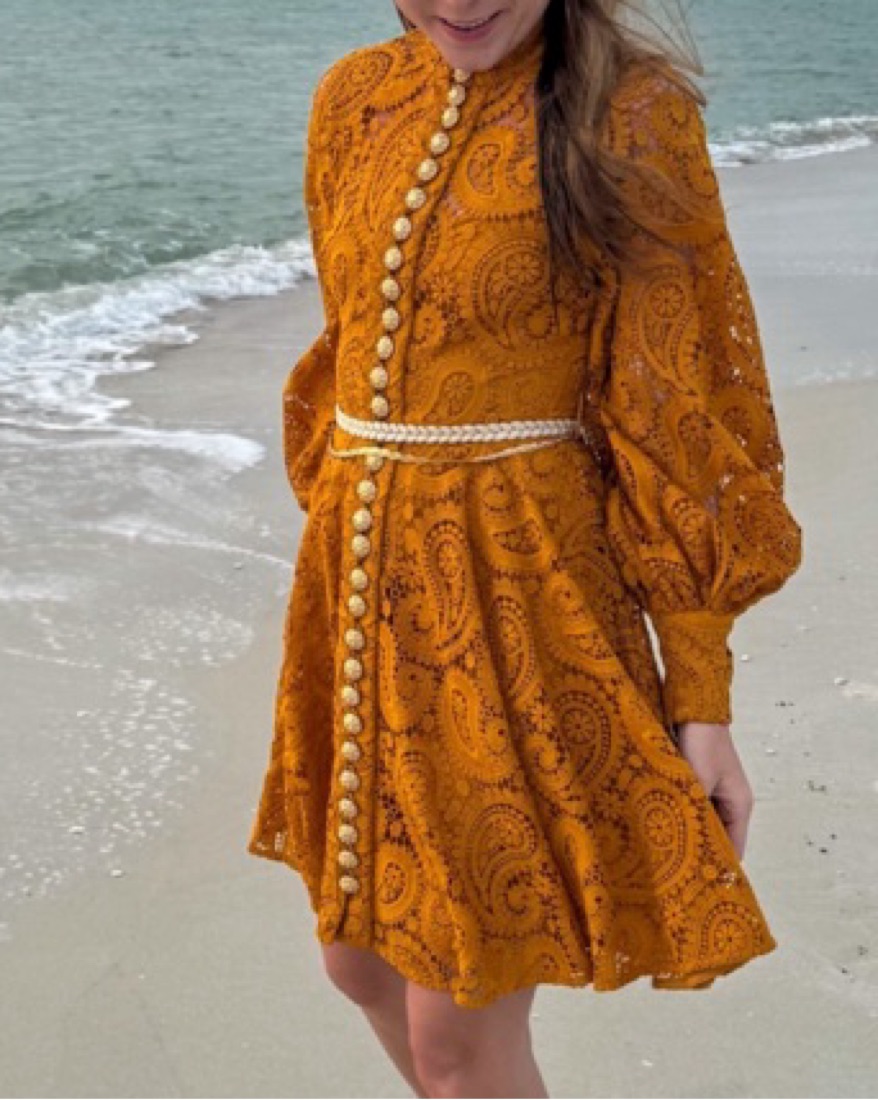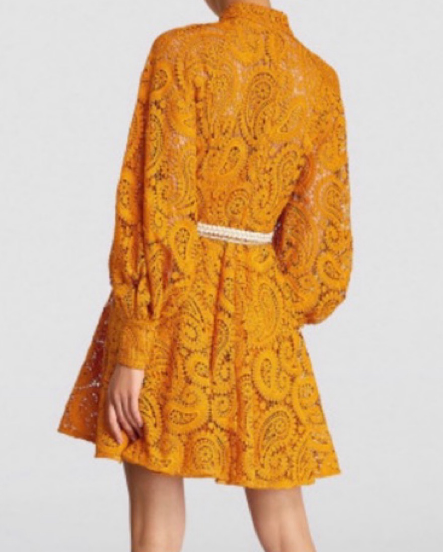 The Anneke Lace Mini Dress in Mustard from Zimmermann's Summer Swim 2022 collection is a boho-inspired paisley-embroidered dress featuring a round neck, blouson sleeves with invisible zips in the cuffs, and raffia buttons with gold hardware down centre front. Removable braided rope and chain belt.