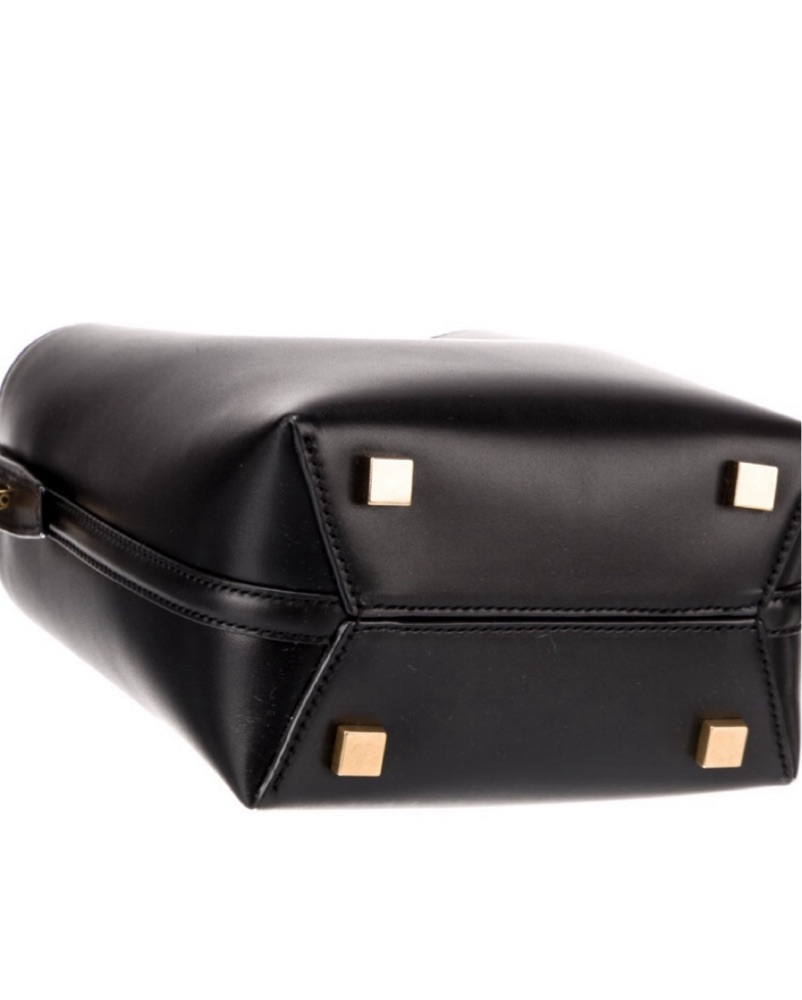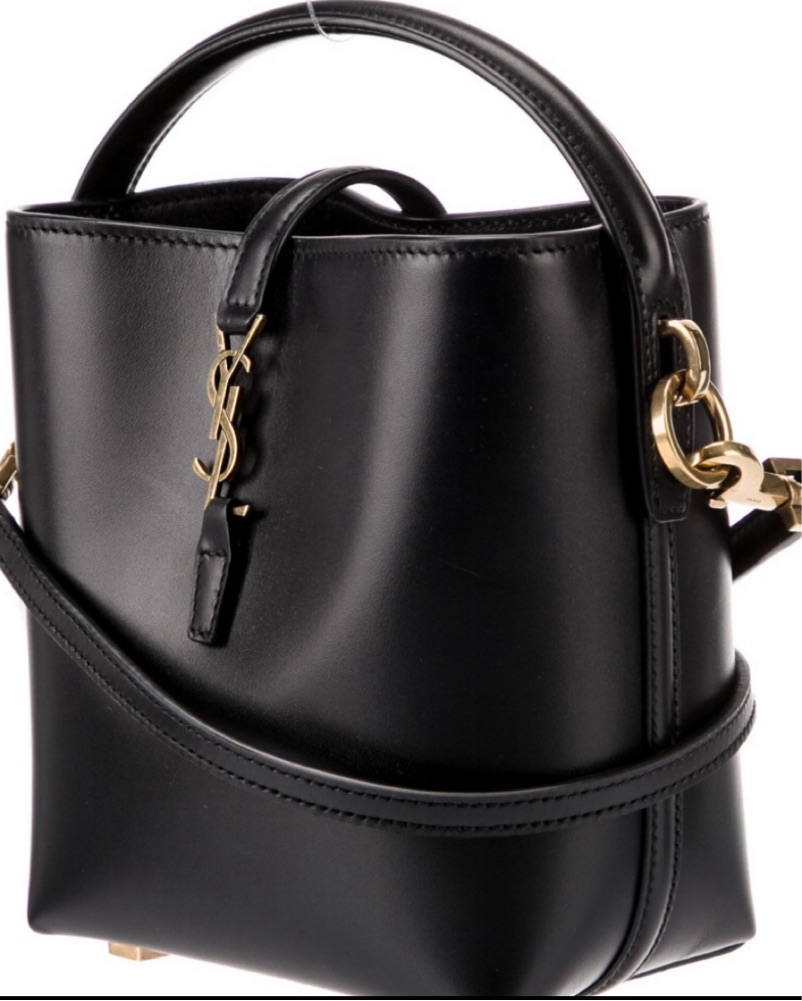 Mini Le 37 bucket bag. Black leather, gold hardware. Top handle and shoulder strap. 6x5.25x3.25