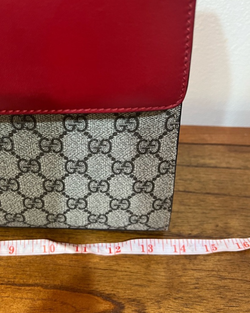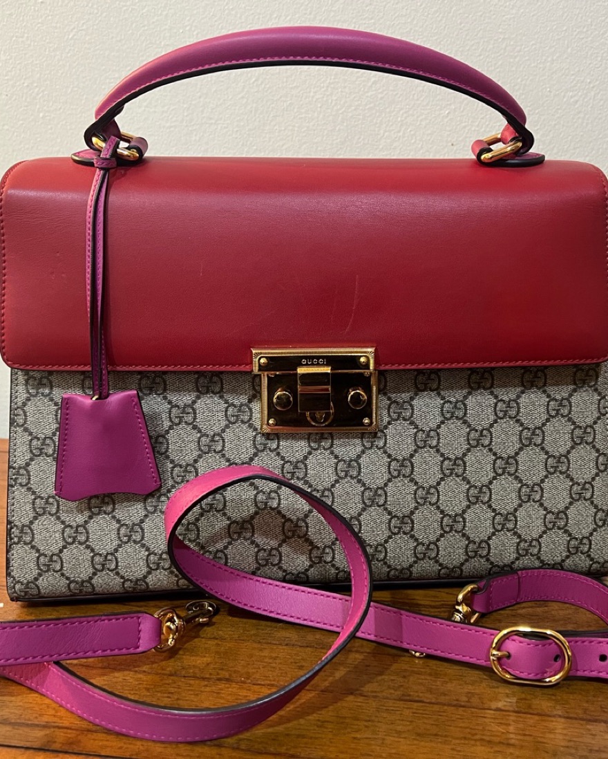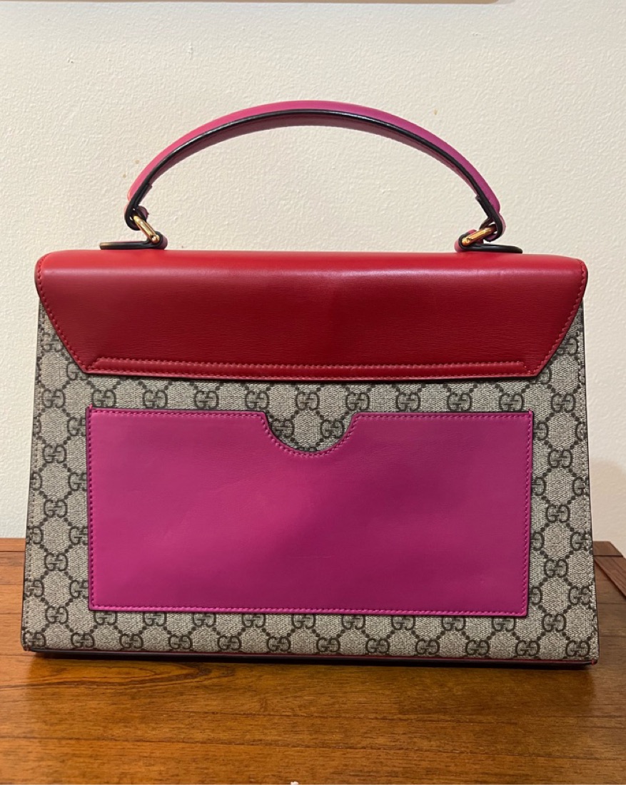 Red and magenta Gucci top-handle bag with detachable shojlder strap. Approx 14” wide, 9” tall, 4” deep at deepest point