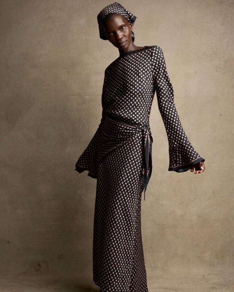 I am 5’3 and this dress is ankle length. Crafted from soft silk-viscose twill and rendered in our Cardinale Foulard print—inspired by a vintage handkerchief—the Davina Dress features a bateau neckline, flared full-length sleeves, and an easy fit.